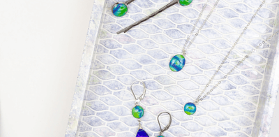 lupus jewelry, necklaces and earrings, laid out on white dish with purple flower