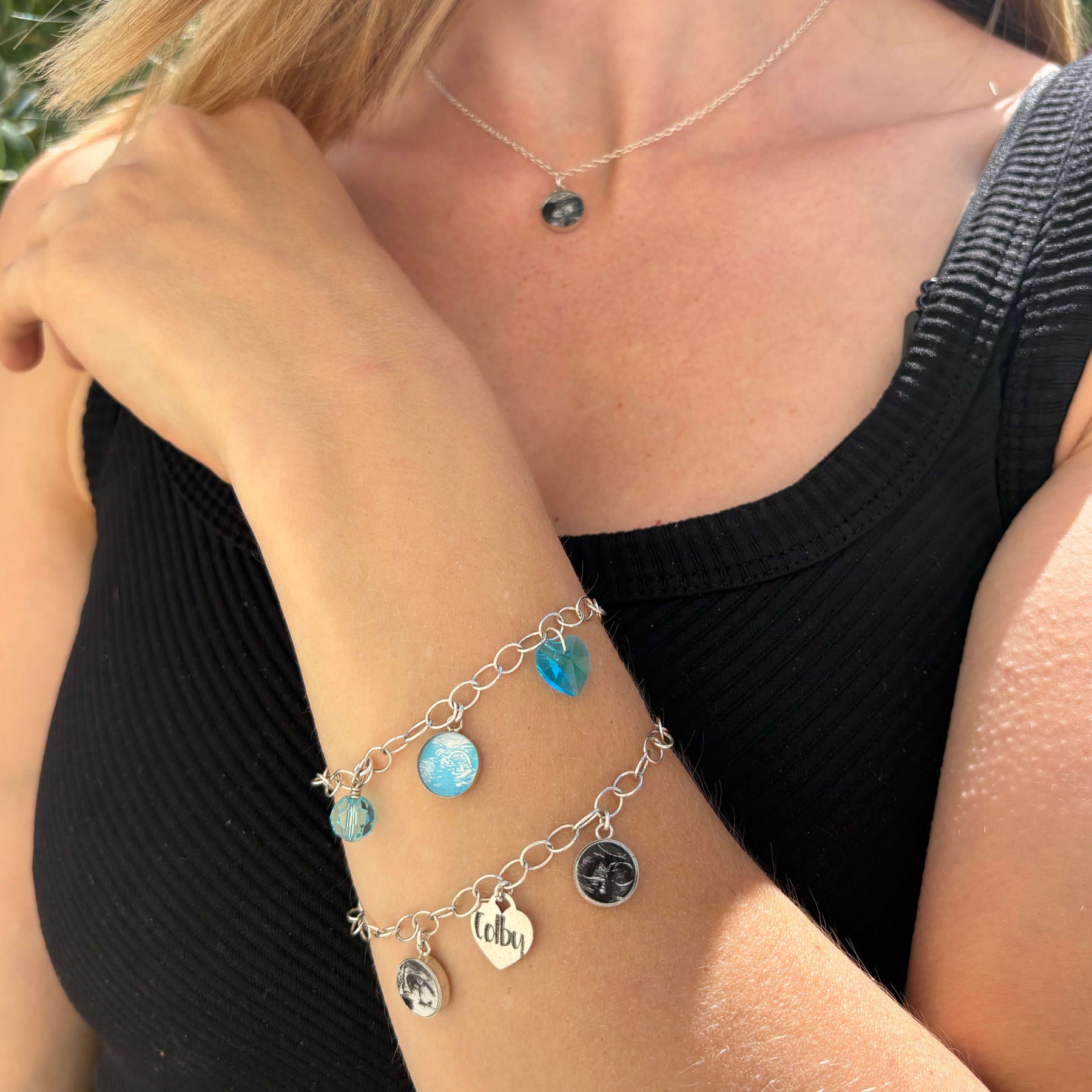 The small round pendants feature your images set under resin and are fixed in place along the chain, creating a balanced design that represents your personal story. You may choose to include up to 5 pendants, allowing you to capture your story from embryo through pregnancy and even a newborn photo. You could also incorporate multiple embryos, transfers, or meaningful milestones throughout your IVF journey. You can choose a custom color for your images as well, such as blue or pink to signify the gender, or choose a favorite color of yours to fit your personal style.