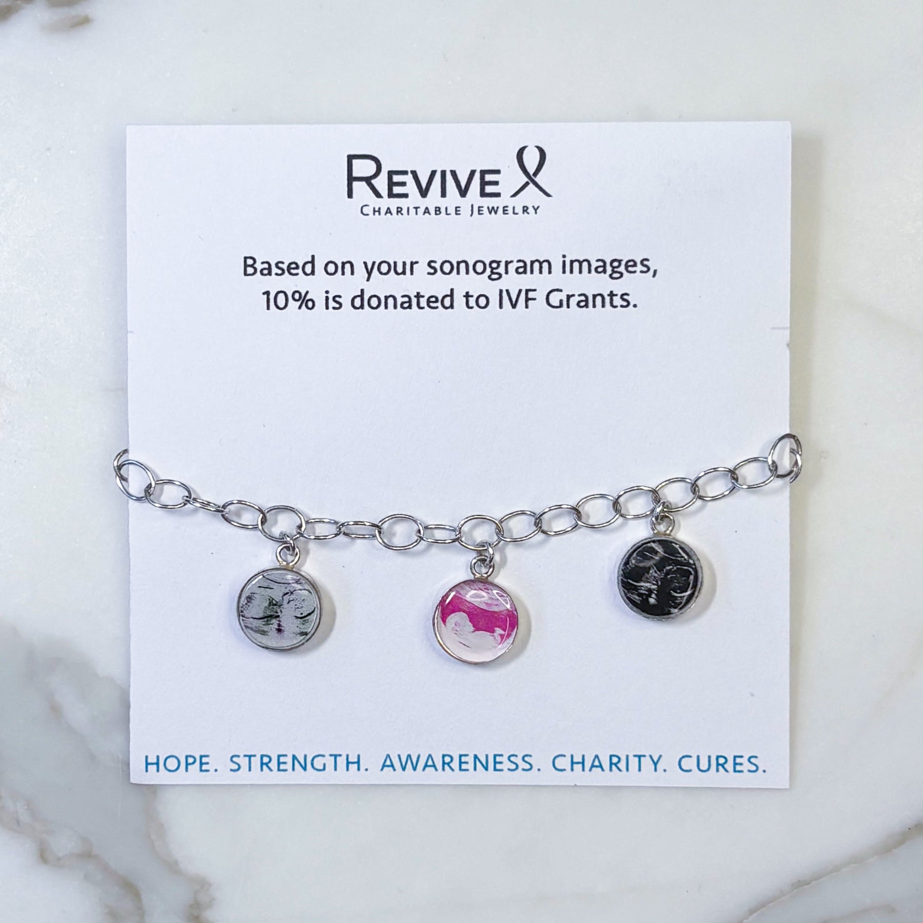 Revive Jewelry brought my heart to life. After losing two embryos during a failed IVF cycle, my heart was shattered. I have kept the image of those embabies in my "treasured box" for years until learning of Revive's customization service where I could send my personal embryo images to be made into jewelry! Working with Revive was seamless from beginning to end. I was able to select all the details and approve before creation. I chose 2 bracelets, a necklace and earrings. When my jewelry set arrived, I was blown away. The quality is impeccable. The attention to detail outstanding. But the greatest detail for me was the emotional impact this customization process had on me was more than I had expected. Seeing the embabies we lost on beautiful jewelry  that I could wear everyday, was a sense of closure...of healing. I cannot recommend Revive Jewelry enough and their customization option to create your own unique pieces from your infertility journey.