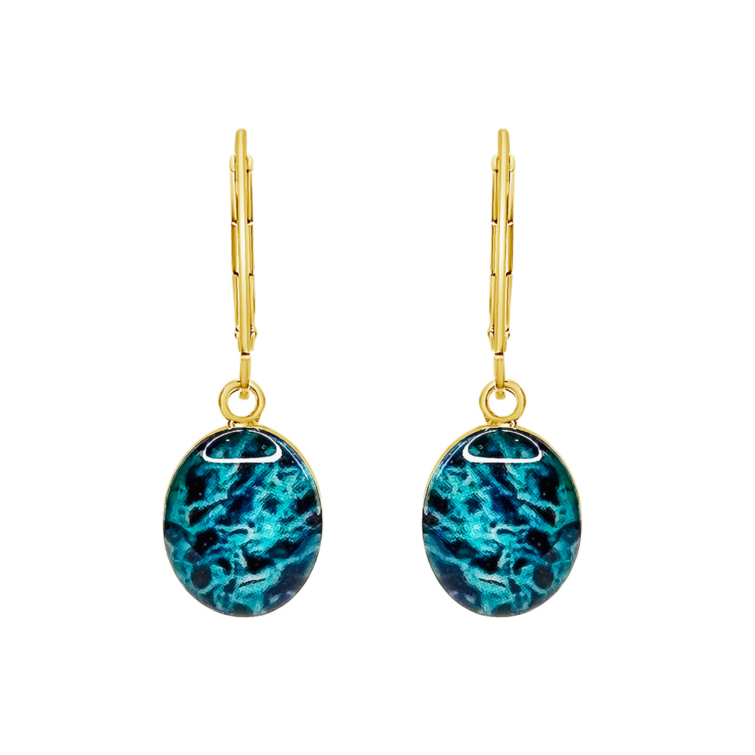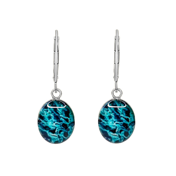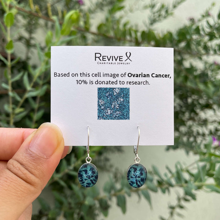 Inspired by all the stories of lives taken too soon by ovarian cancer, these handmade earrings feature sterling silver or 14k gold filled oval pendants with cell images of Ovarian Cancer in resin. Finished with secure lever back ear wires.