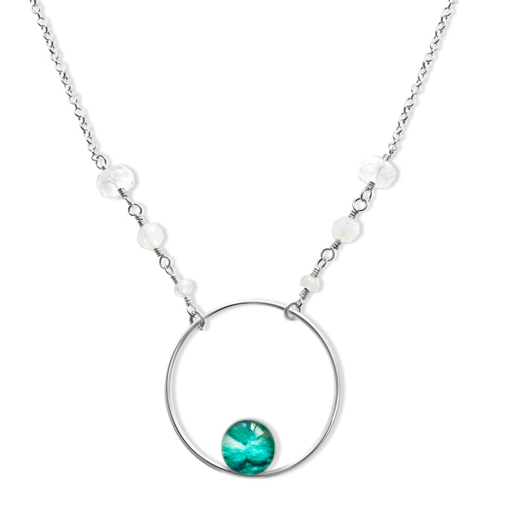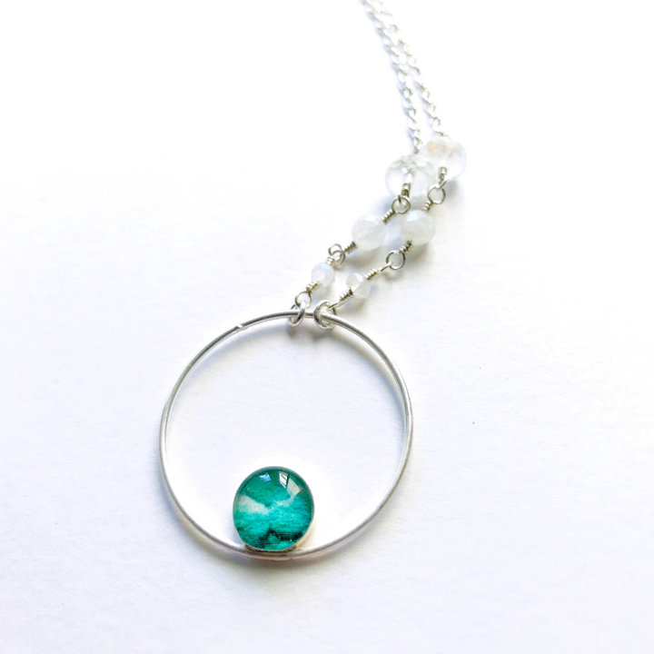 The overall shape of the necklace is symbolic of the embryo taking root in the womb. It reminds you of your natural feminine ability and the beauty in creating life.  An adjustable sterling silver 17-19” chain, accented by 3 sizes of reflective moonstone to enhance fertility. These stones give off blue flashes when the light catches them. The pendant is made of a sterling silver circular outline with a smaller round pendant containing a resin covered image of an early embryo.