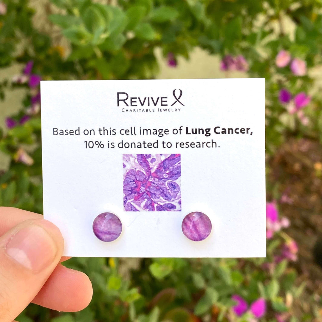 Featuring purple and pink hand-cut cell images of Lung Cancer set in resin, these earrings raise funds and spread awareness. Designed for everyday wear so you can show your support everywhere you go.