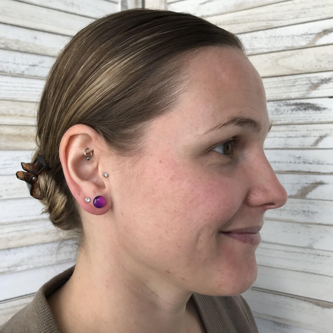 Model wearing lung cancer awareness stud earrings in purple and pink.