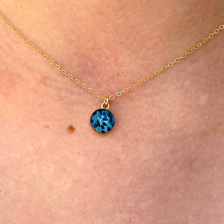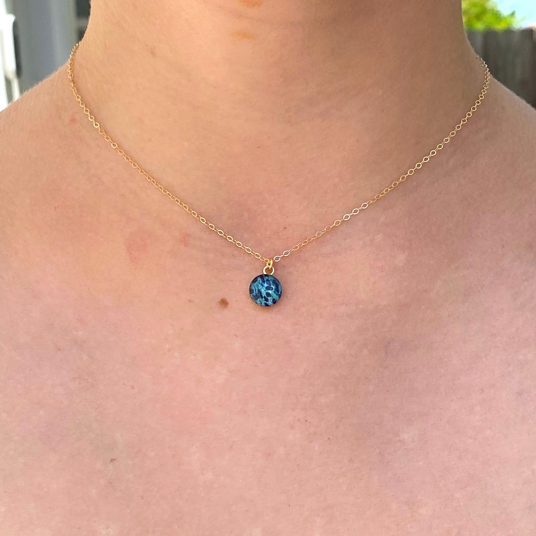 These cute small pendants move as you wear them & are understated in the perfect way for an everyday earring. The round pendants are hand cut photos of an Ovarian Cancer cell encased in resin. Wear them with any outfit to show your support in style!