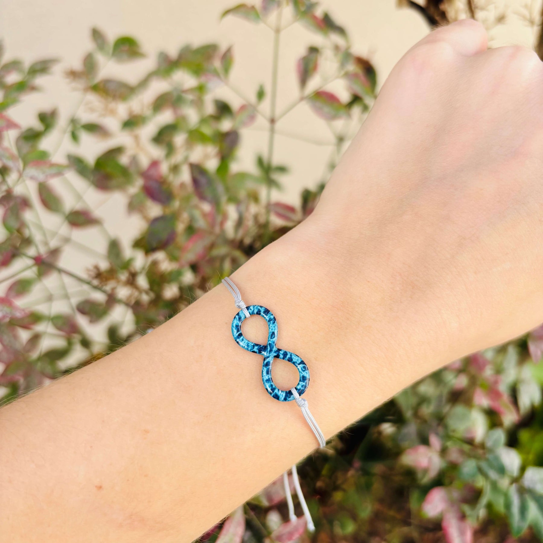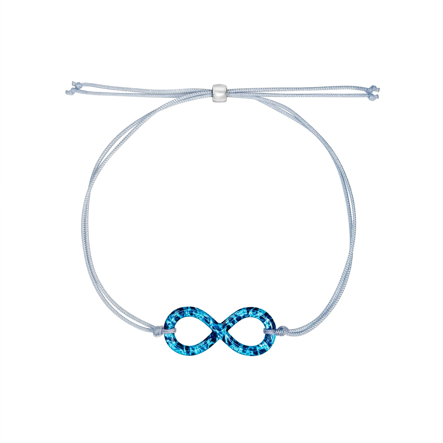 Handcrafted with a cell image of Ovarian Cancer, the infinity charm is cut out and encased in clear resin, transforming science into art. The design is finished with a durable, adjustable gray cord and a sterling silver slide clasp, offering both comfort, ease and elegance for everyday wear.