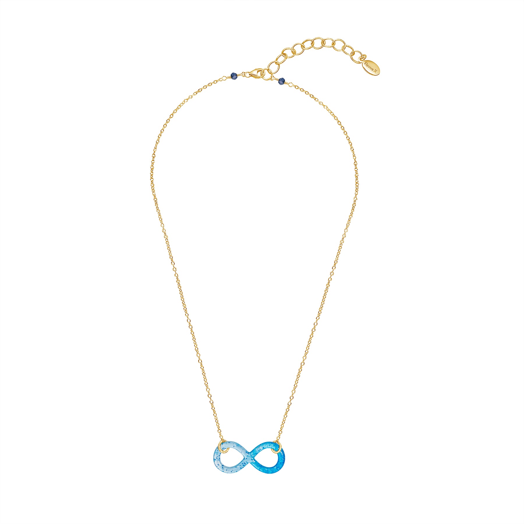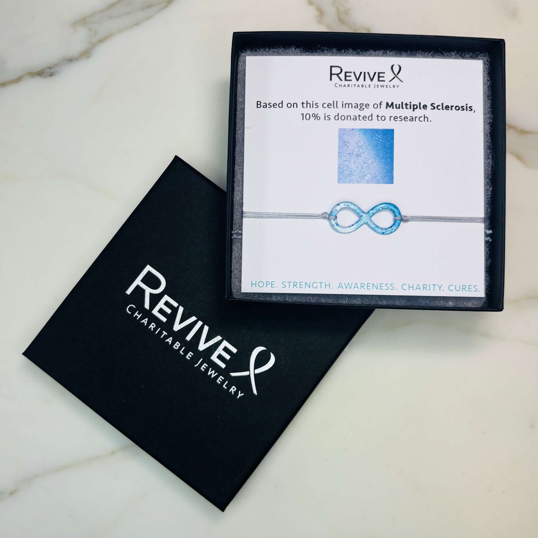 Handcrafted with a cell image of Multiple Sclerosis, the infinity symbol is delicately cut out and encased in clear resin, creating a one-of-a-kind miniature work of art. Available in your choice of sterling silver or 14k gold-filled chain, adjustable from 18-20 inches and finished with a lobster clasp with Denim Blue Quartz stones. Each necklace is hypoallergenic and designed for everyday wear.