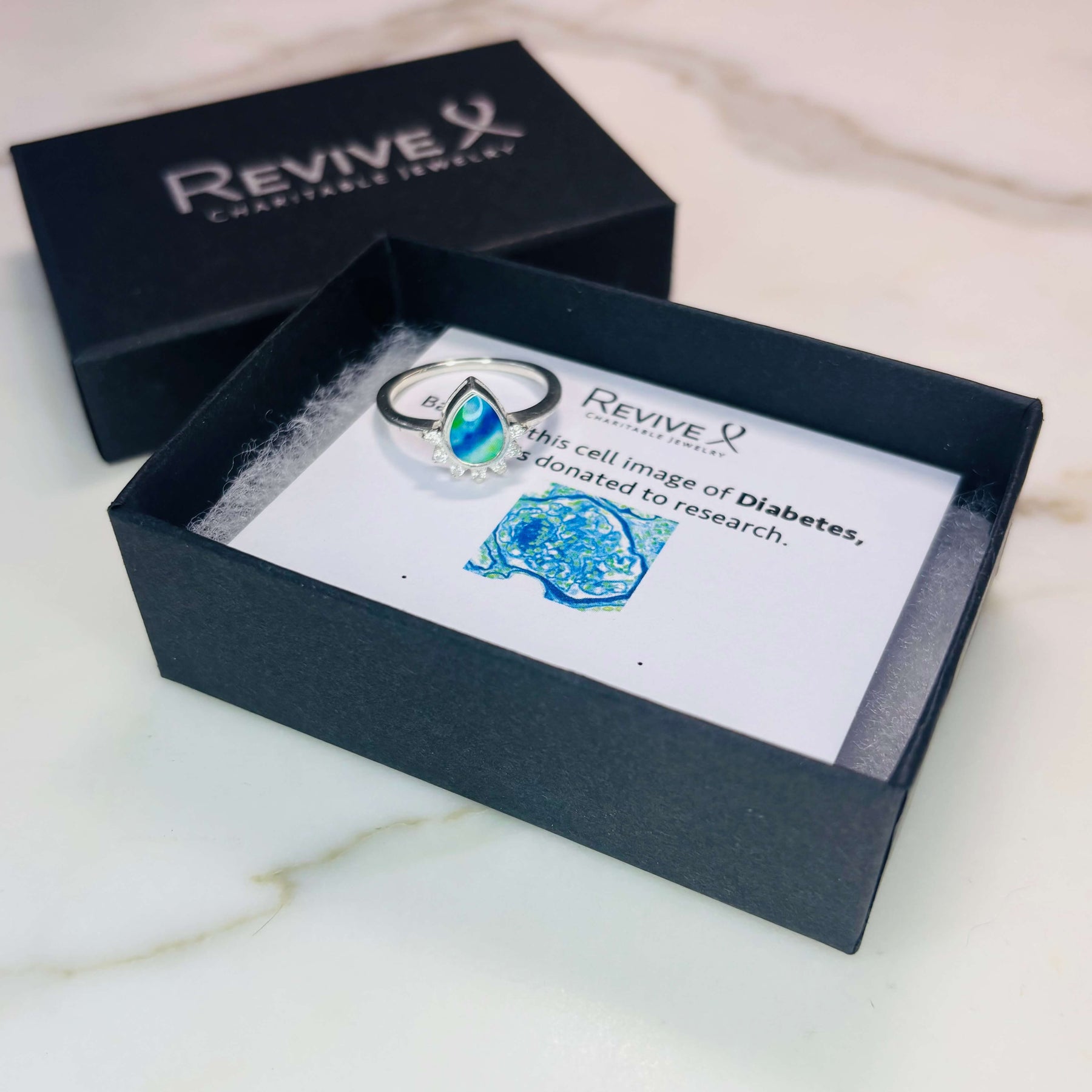 Each ring features a teardrop-shaped bezel filled with a cell image of Diabetes, encased in resin and framed by a half halo of sparkling cubic zirconia stones. Handcrafted in sterling silver, it’s designed to be both stunning and symbolic. The halo is a tribute to those we’ve lost and a beacon for those who continue to fight, a reminder that hope glows brightest in our hearts.
