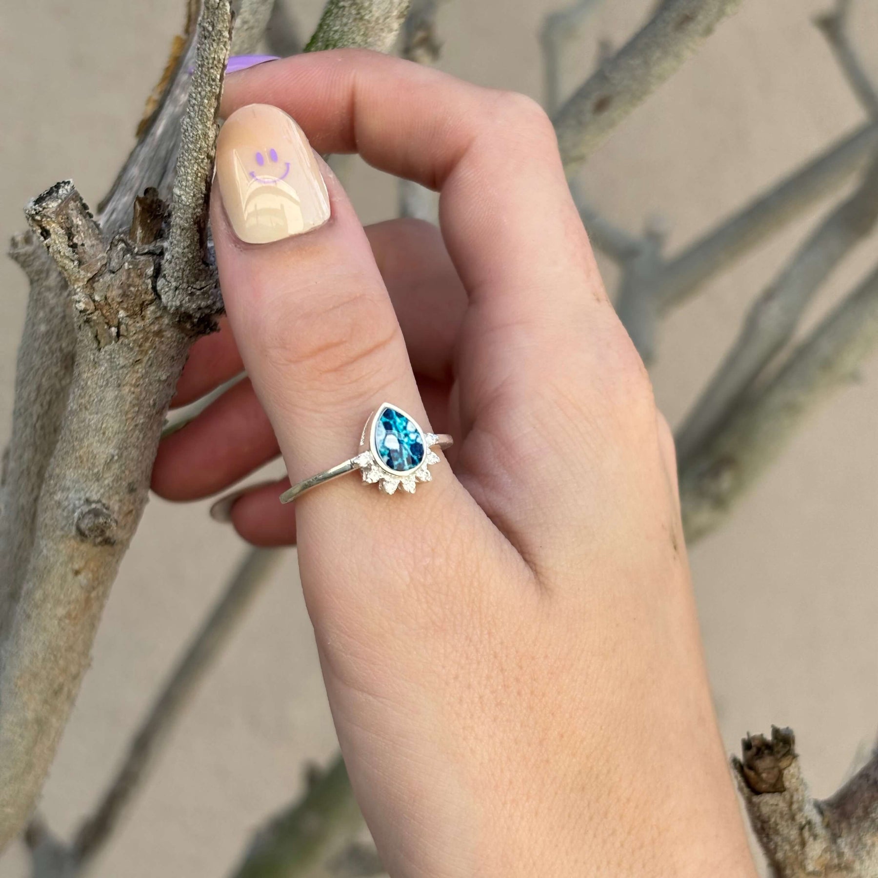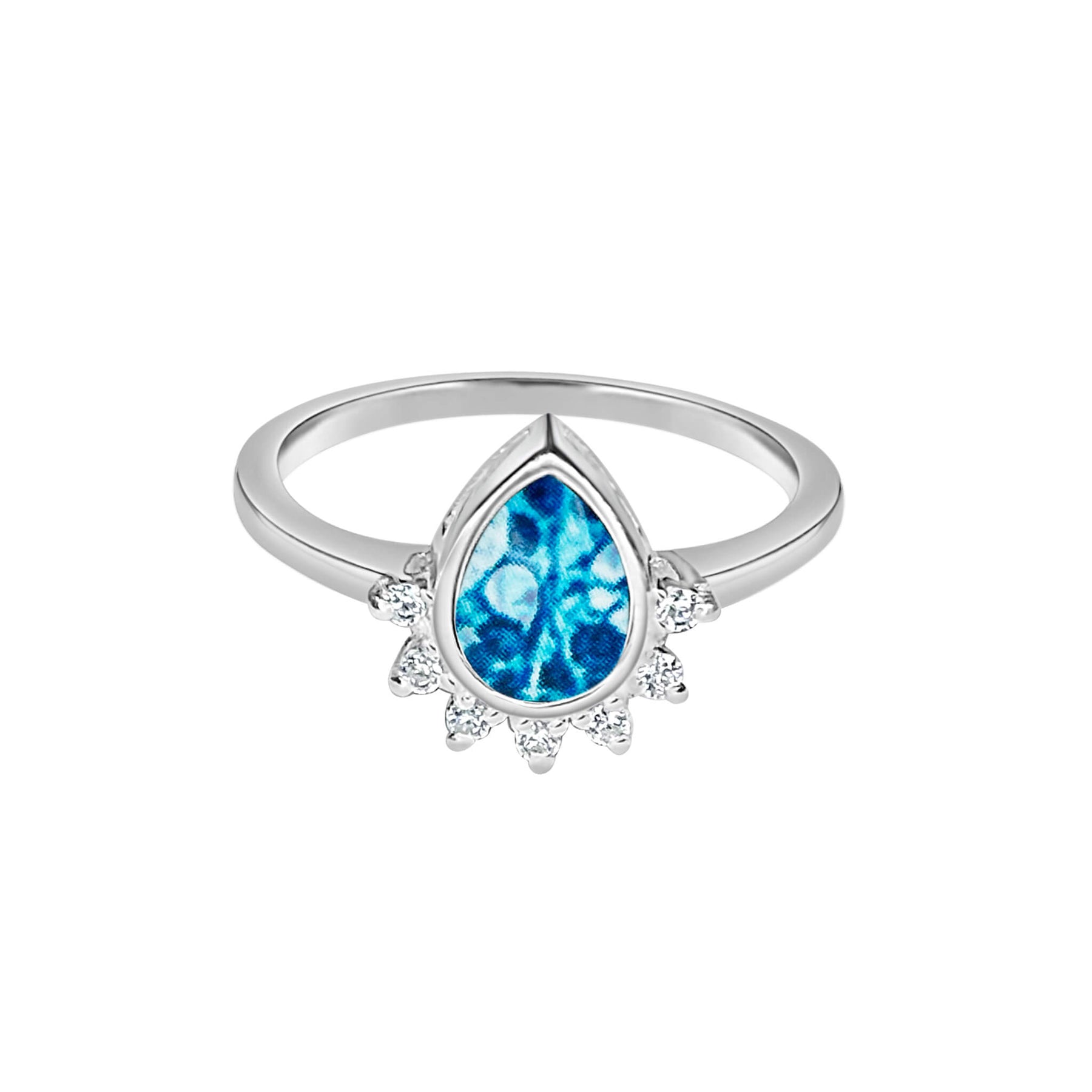 Each ring features a teardrop-shaped bezel filled with a cell image of Ovarian Cancer, encased in resin and framed by a half halo of sparkling cubic zirconia stones. Handcrafted in sterling silver, it’s designed to be both stunning and symbolic. The halo is a tribute to those we’ve lost and a beacon for those who continue to fight, a reminder that hope glows brightest in our hearts.