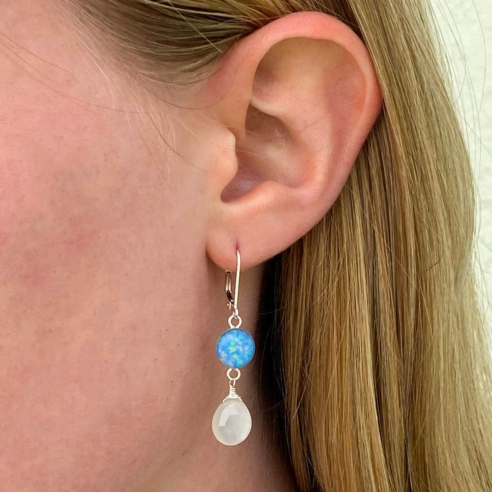 model wearing sterling silver melanoma awareness earrings with resin pendants on lever backs.