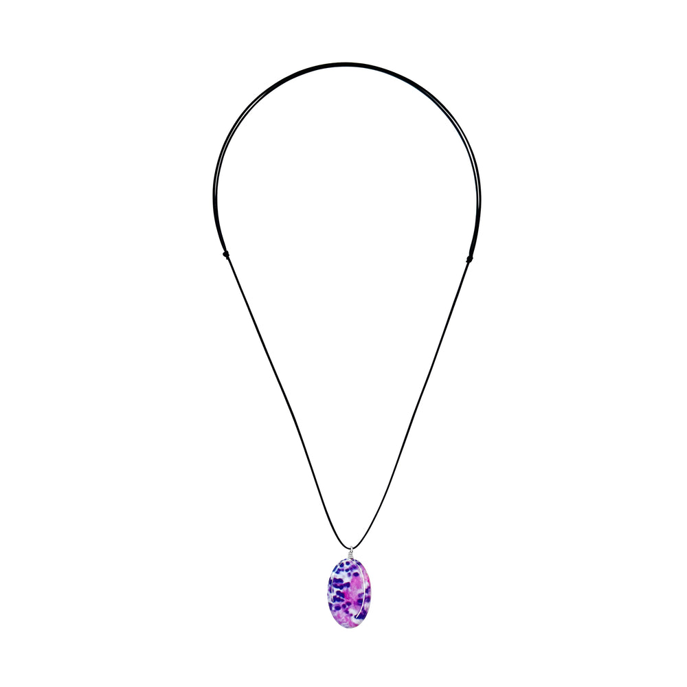 Model wearing pink and purple handmade oval sterling silver necklace for lupus awareness