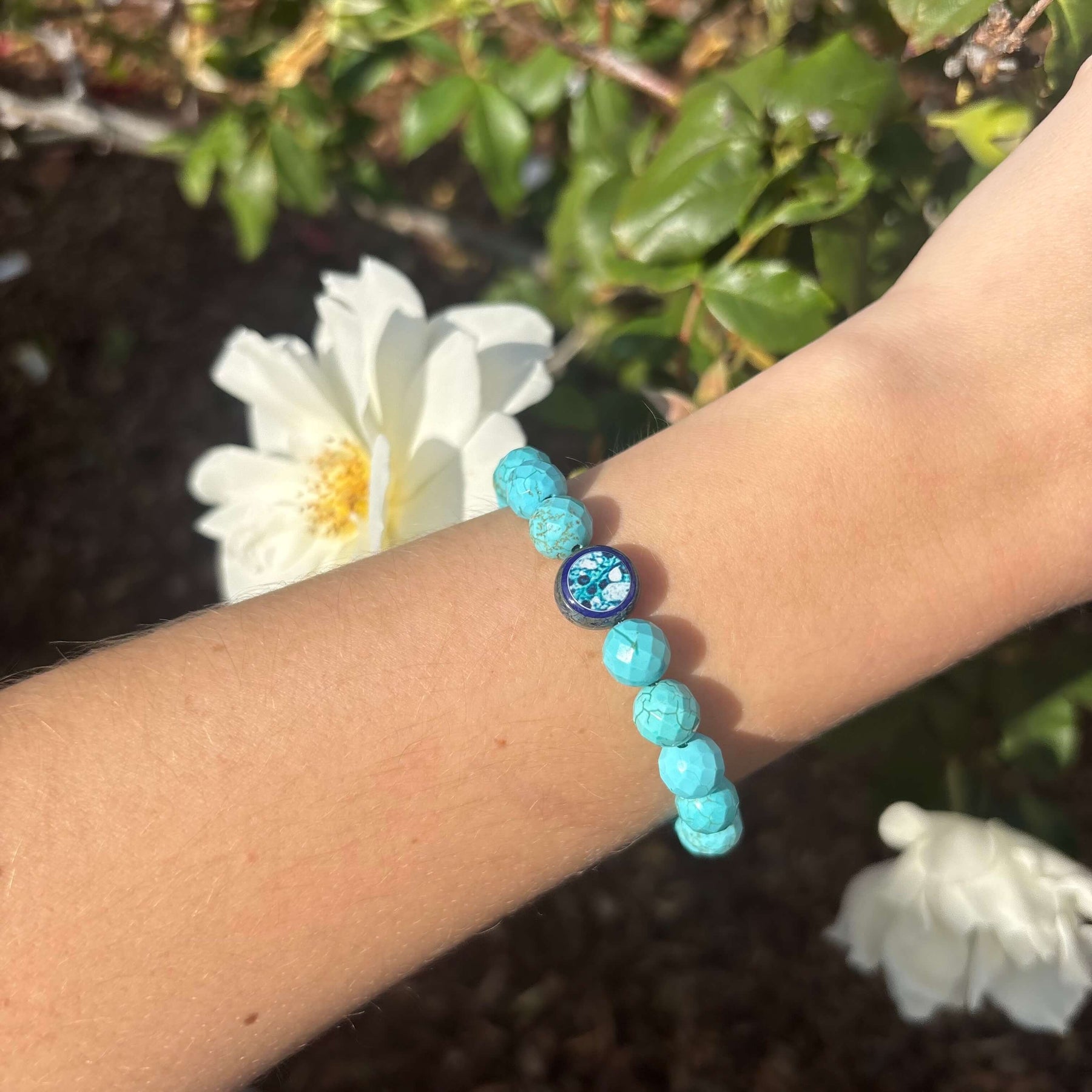 teal turquoise stone stretch bracelet with ovarian cancer cell image in resin pendant on model