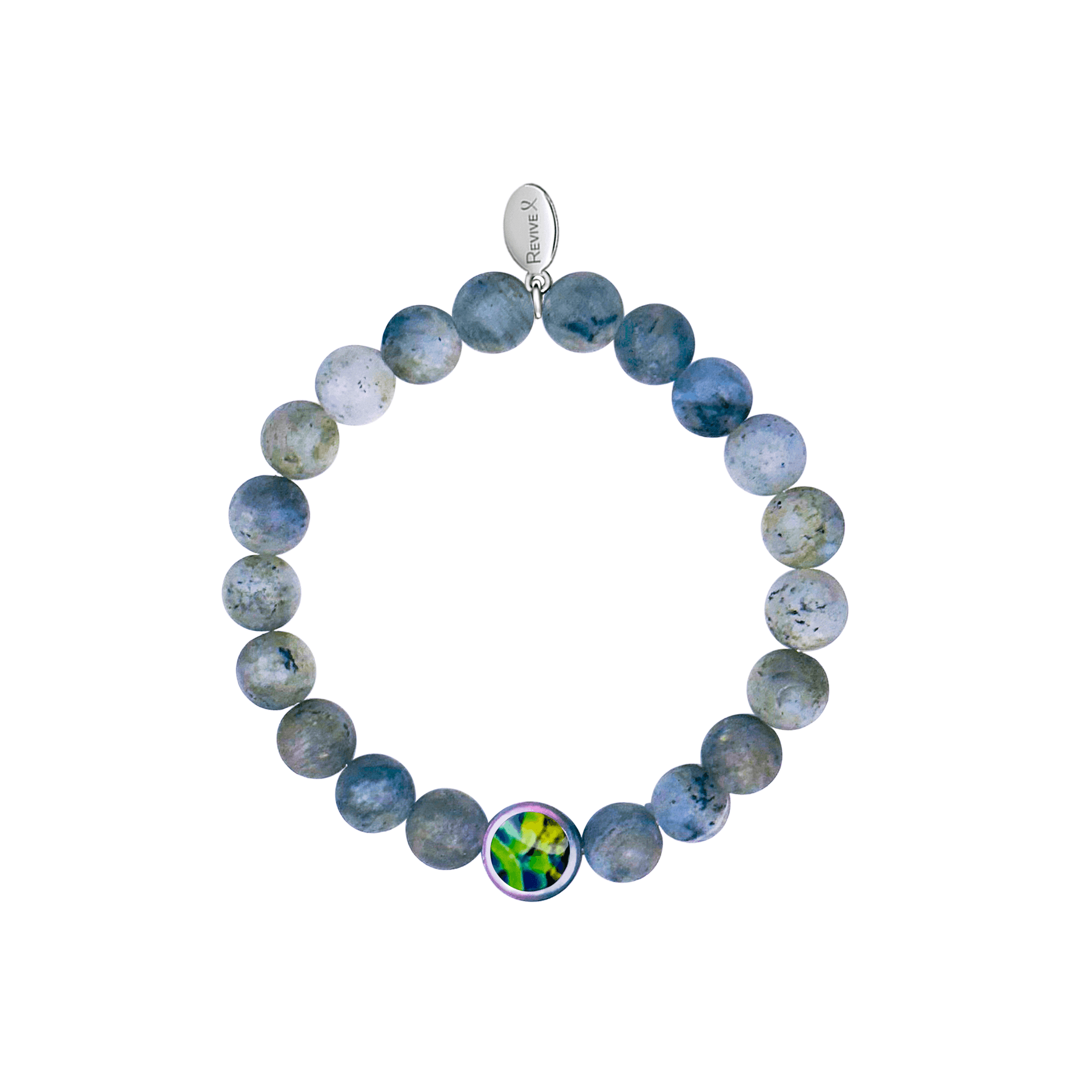 This men's bracelet features a round Abalone coin with a hand cut cell image set under resin. Accentuated by smooth matte Labradorite stones on a stretch cord. Available in select causes. Show your support in style with this awareness jewelry for men.