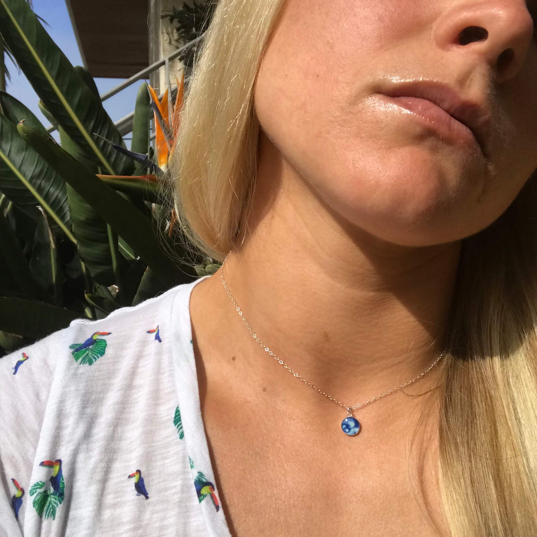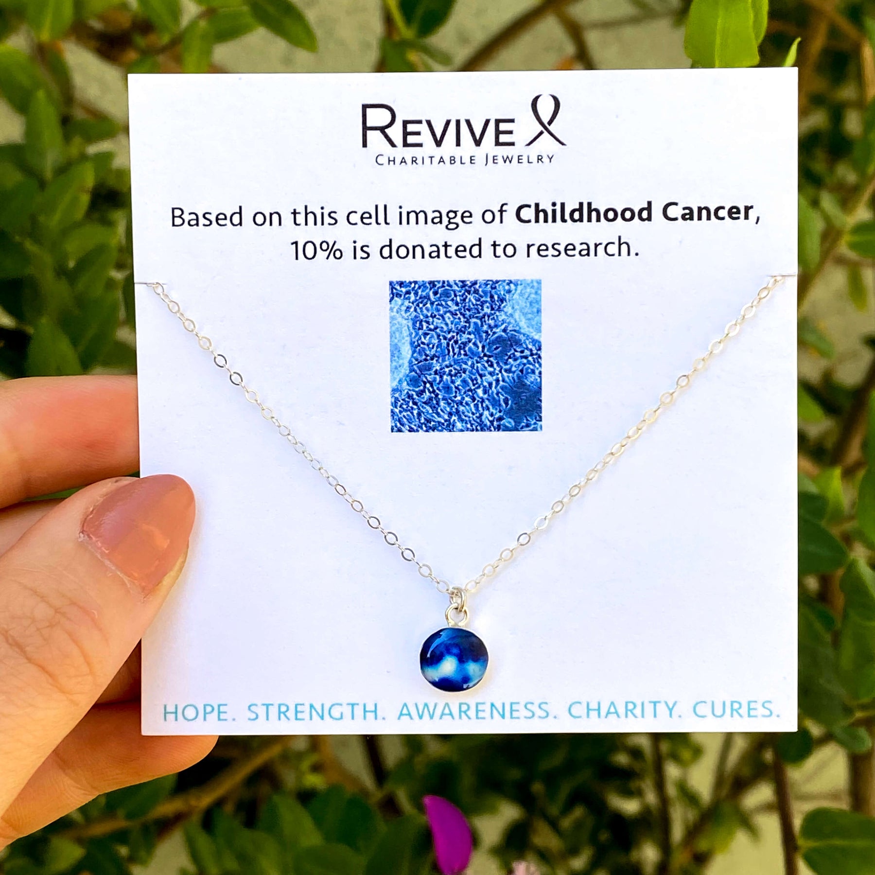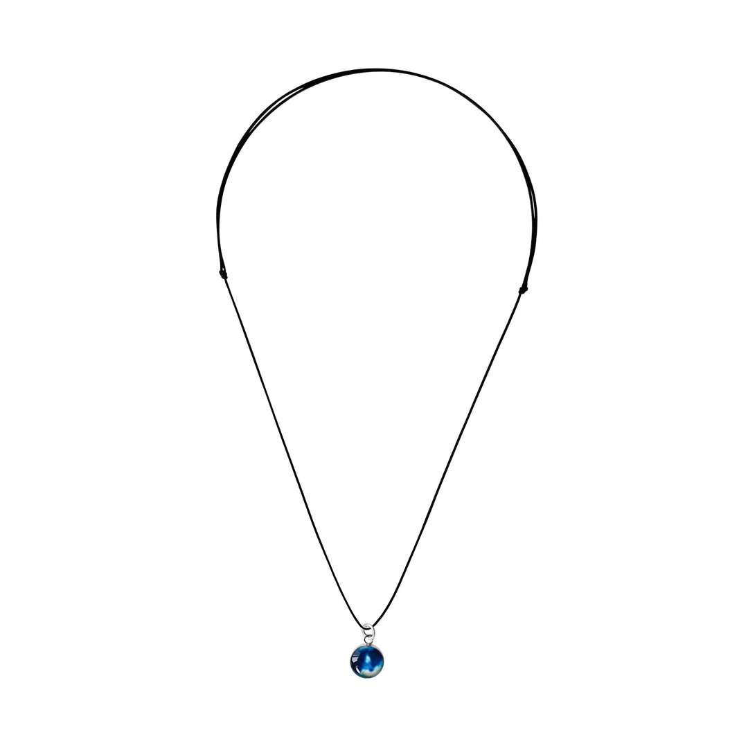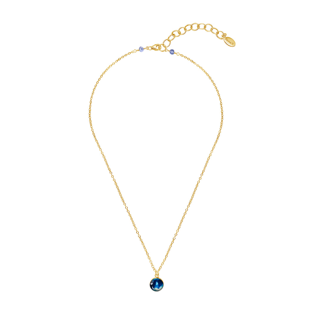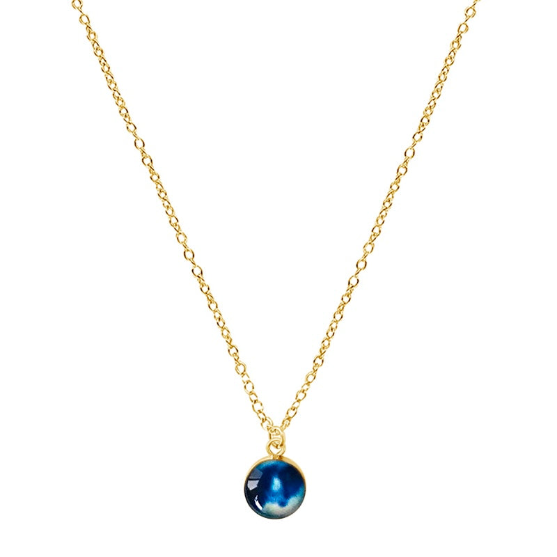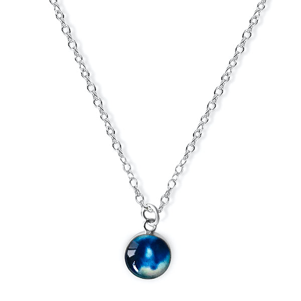 This small round pendant features a hand-cut photo of a Neuroblastoma cell encased in resin. The dainty chain is finished off in the back with two faceted Denim Blue Quartz stones for a little extra sparkle. Choose between a 16-18 inch Sterling Silver or Gold Filled chain or an adjustable 12-24 inch black cord.