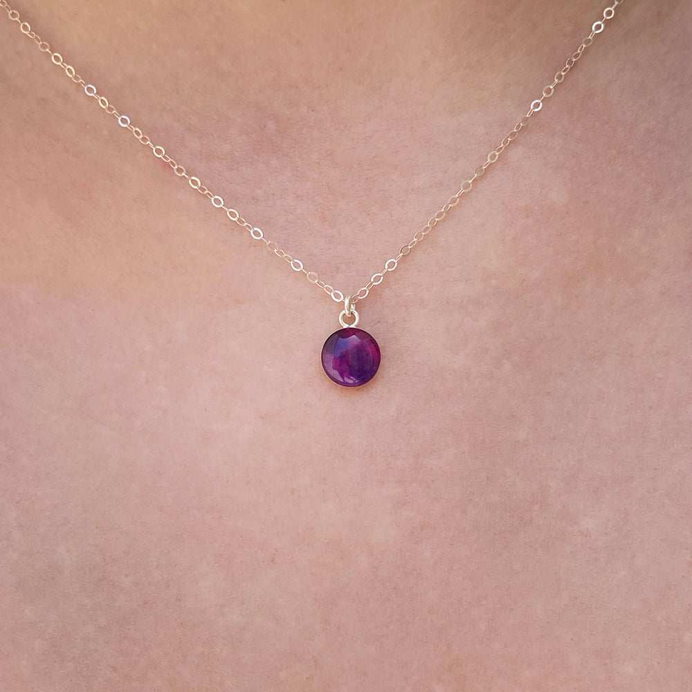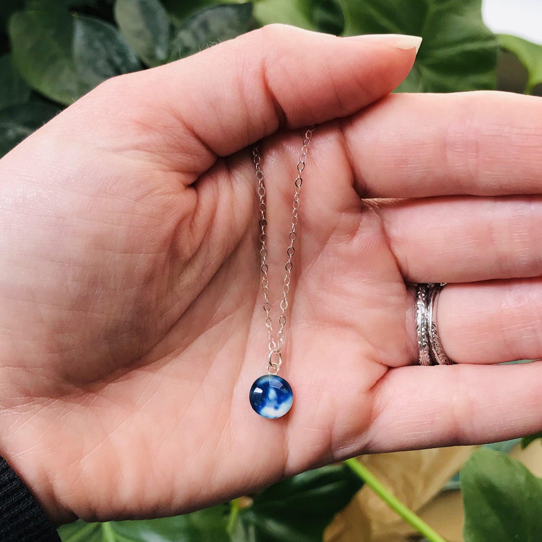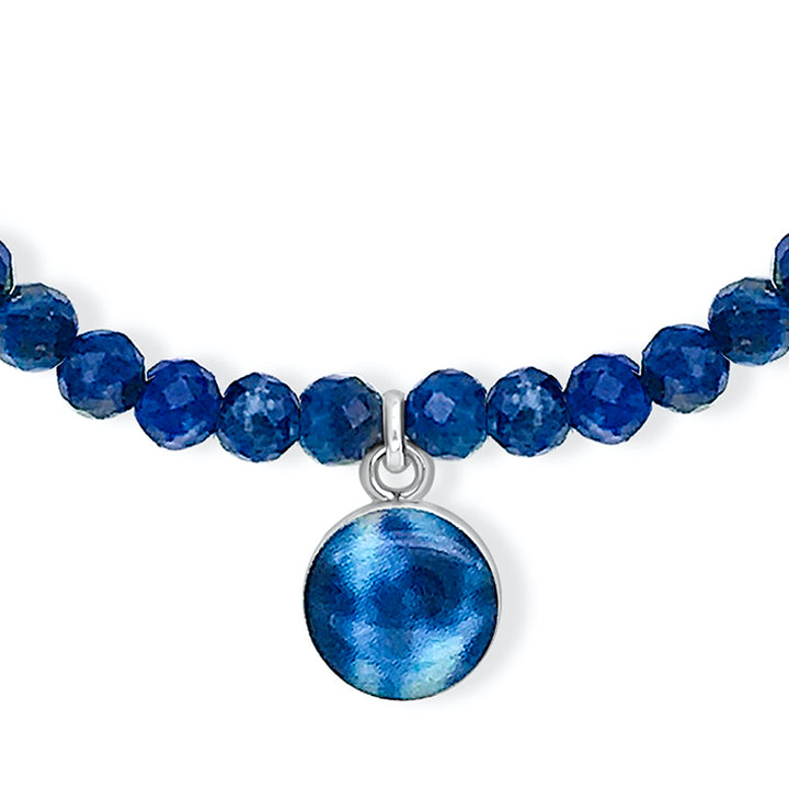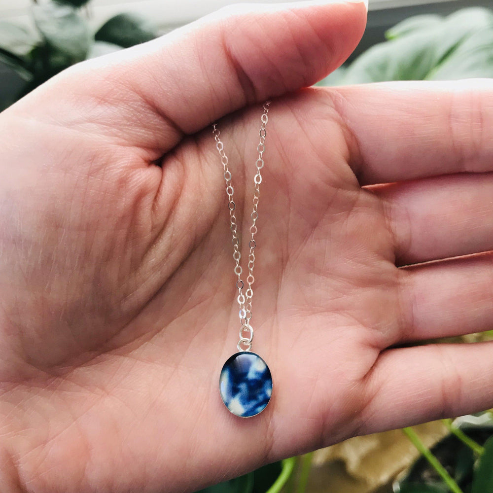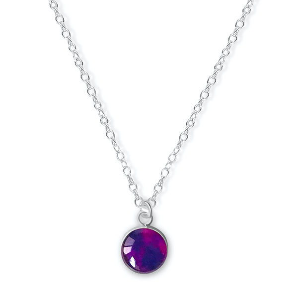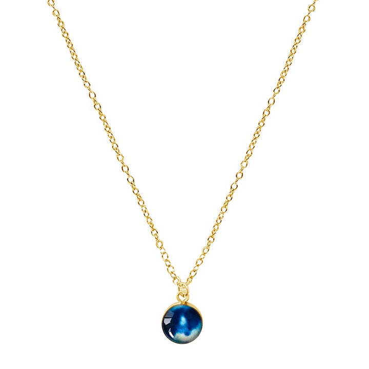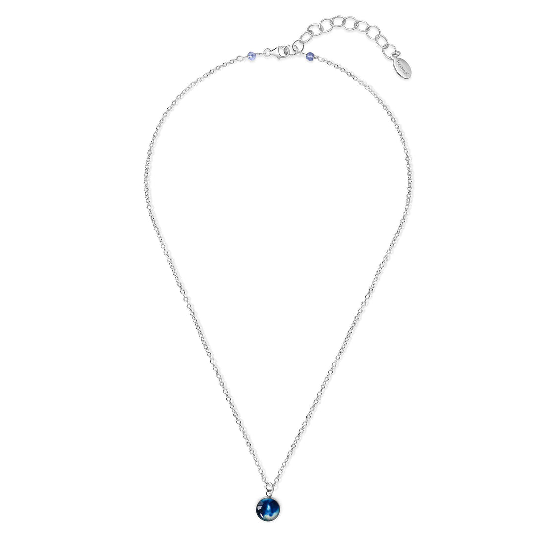 This small round pendant features a hand-cut photo of a Neuroblastoma cell encased in resin. The dainty chain is finished off in the back with two faceted Denim Blue Quartz stones for a little extra sparkle. Choose between a 16-18 inch Sterling Silver or Gold Filled chain or an adjustable 12-24 inch black cord.