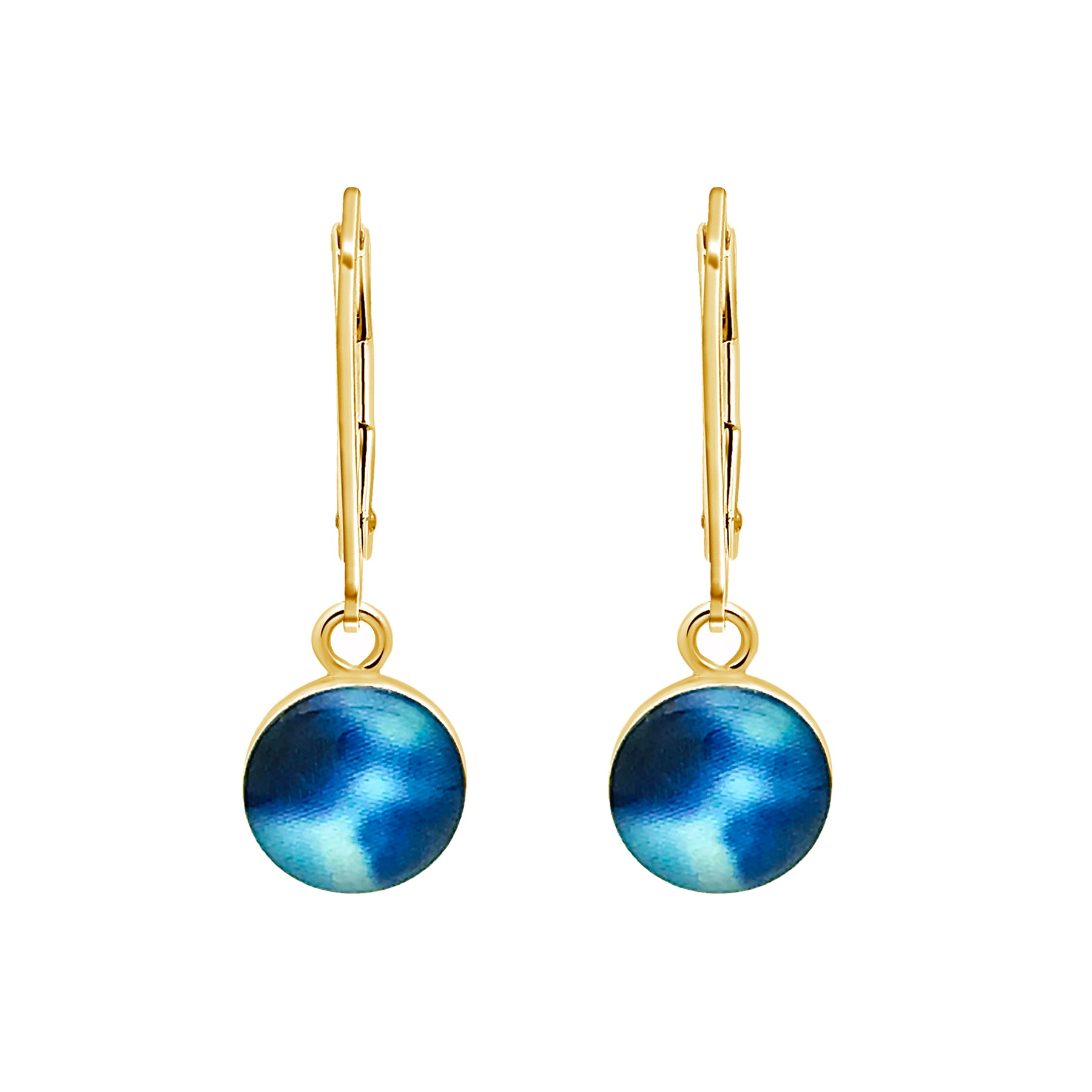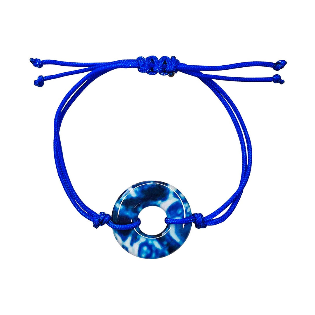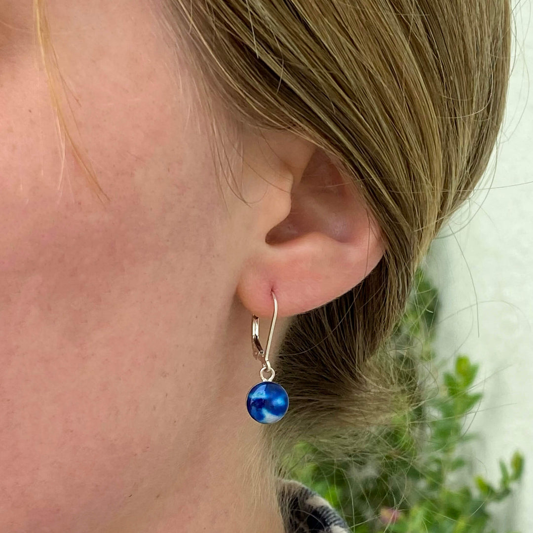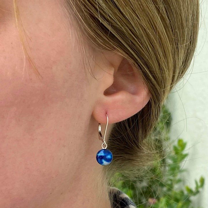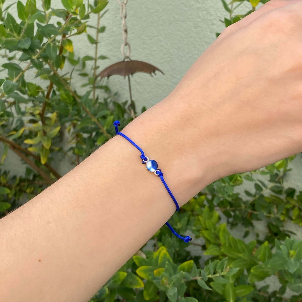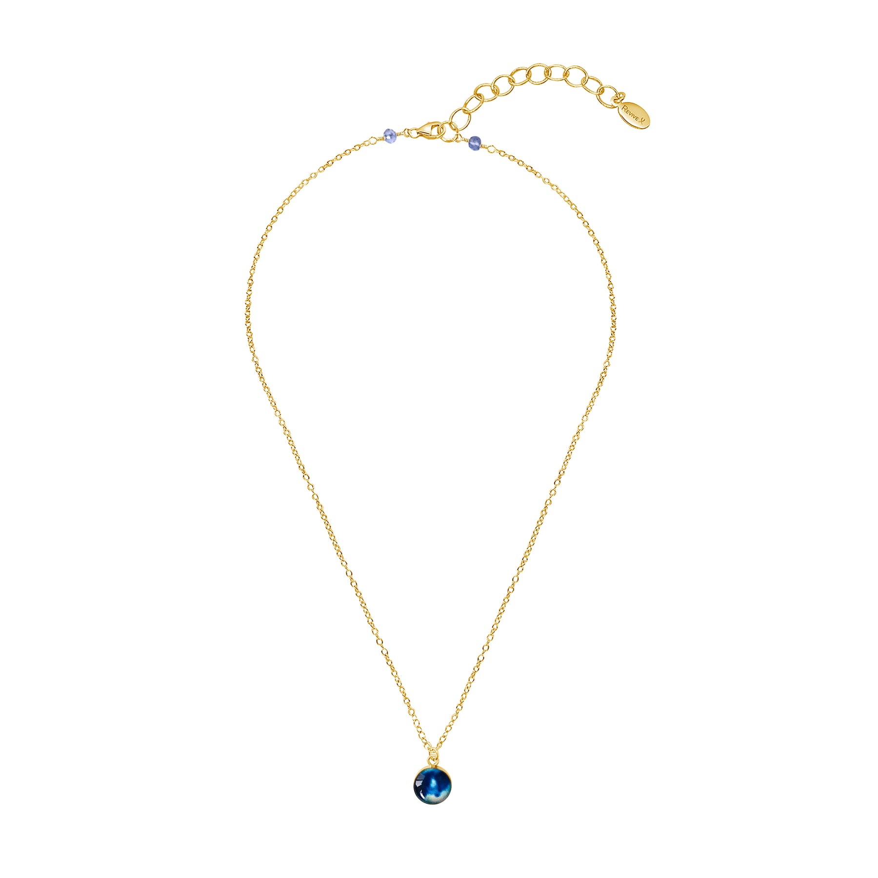 This small round pendant features a hand-cut photo of a Neuroblastoma cell encased in resin. The dainty chain is finished off in the back with two faceted Denim Blue Quartz stones for a little extra sparkle. Choose between a 16-18 inch Sterling Silver or Gold Filled chain or an adjustable 12-24 inch black cord.