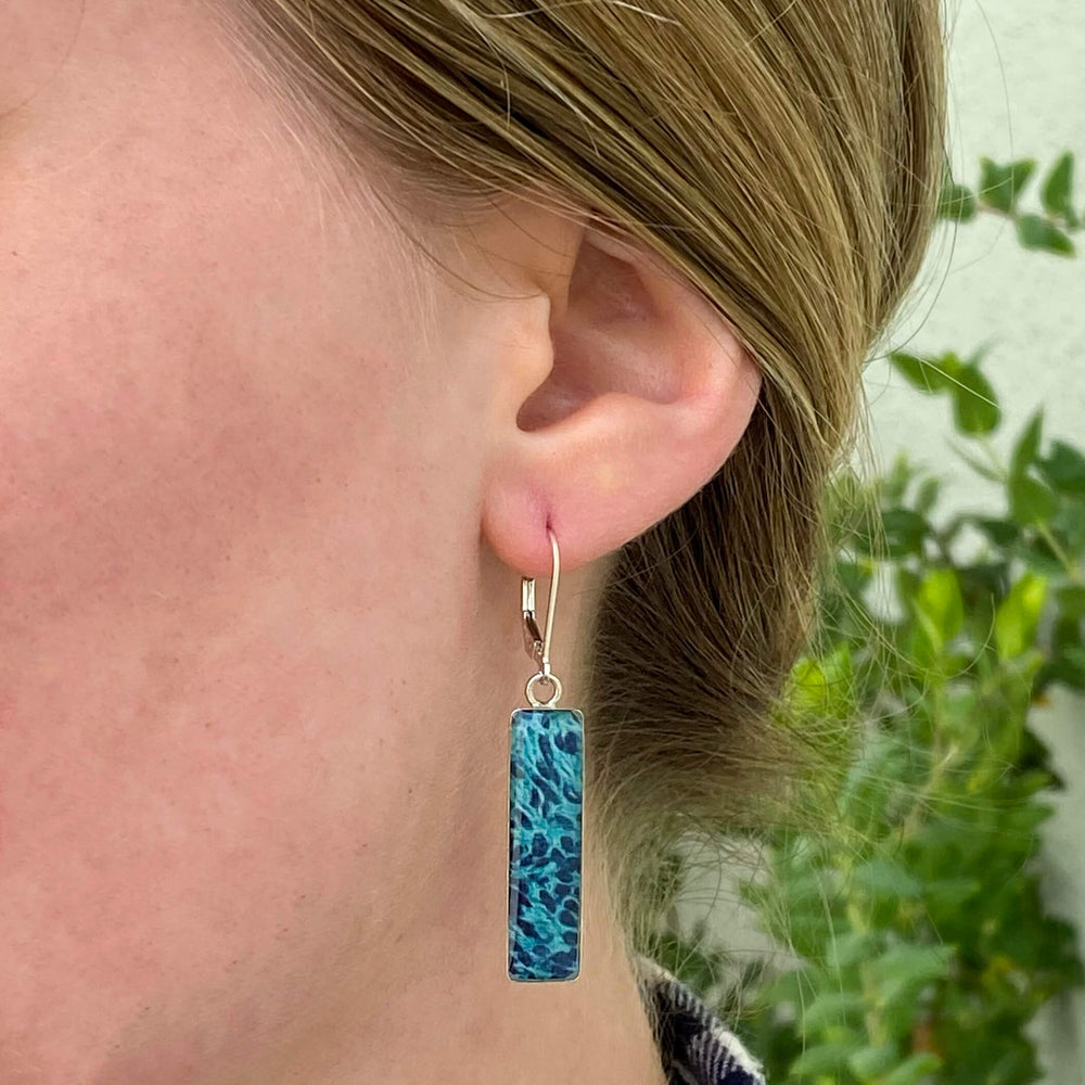 model wearing Teal and Blue sterling silver Ovarian Cancer earrings with resin pendants on lever backs