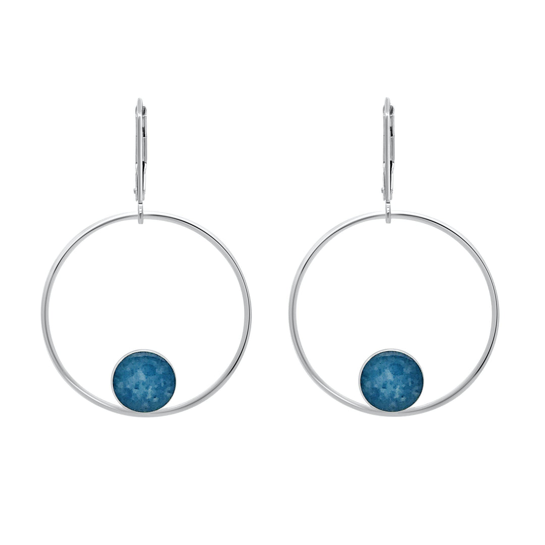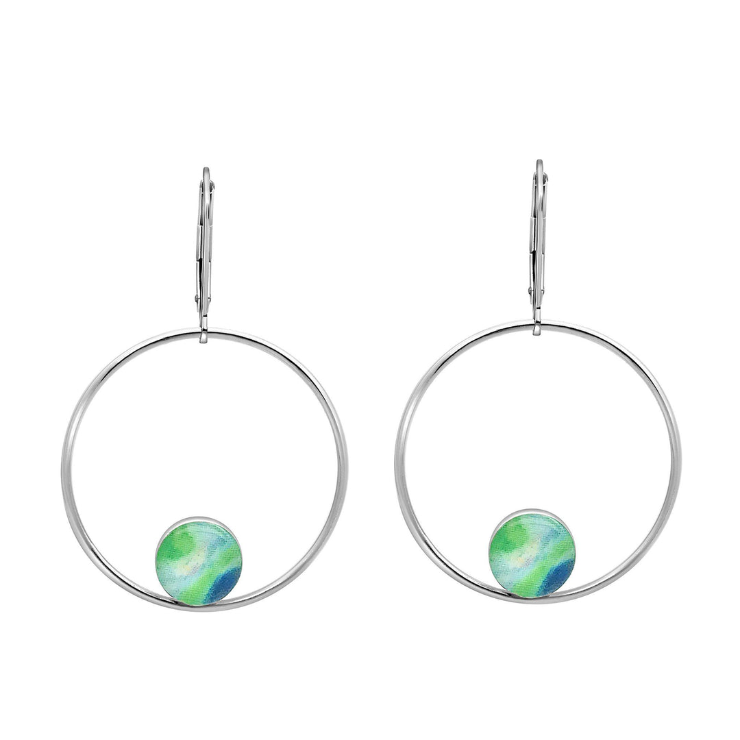 unity hoop earrings for HIV AIDS awareness, sterling silver large hoops with smaller circular pendants at bottom of HIV AIDS scientific image under resin
