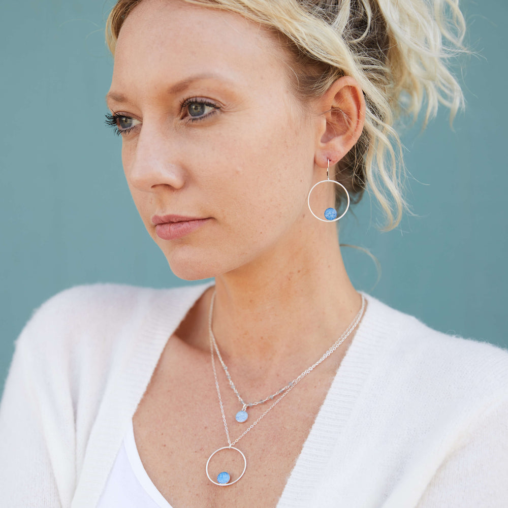 woman wearing unity earrings and matching unity necklace and front & center necklace for multiple sclerosis research