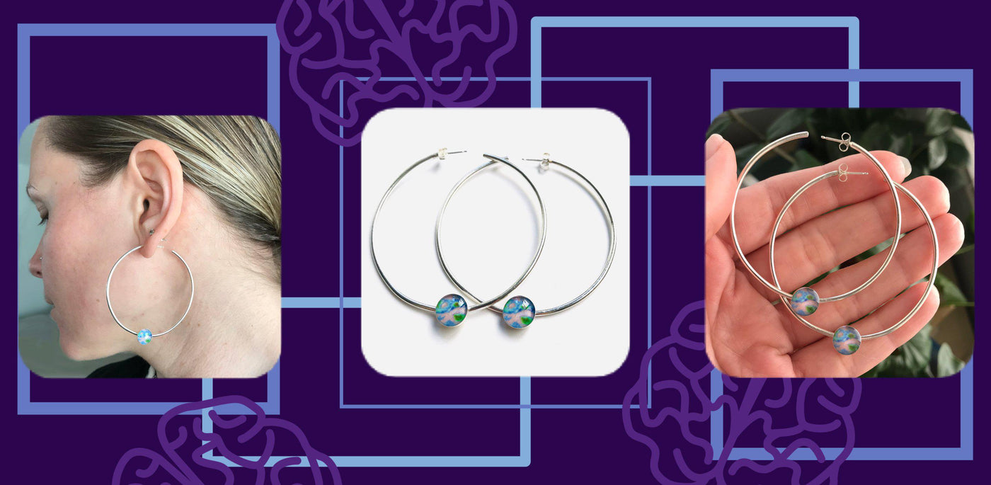 The Power Hoops feature a 2” diameter sterling silver wire hoop and a round pendant with the hand cut Alzheimer's cell image in resin. Remember that everything is cyclical. The world keeps on turning, the days keep passing, no matter what we’re going through. When it’s hard to find the strength to keep going, these earrings will remind you of the cause that’s worth fighting for and empower you to keep going.