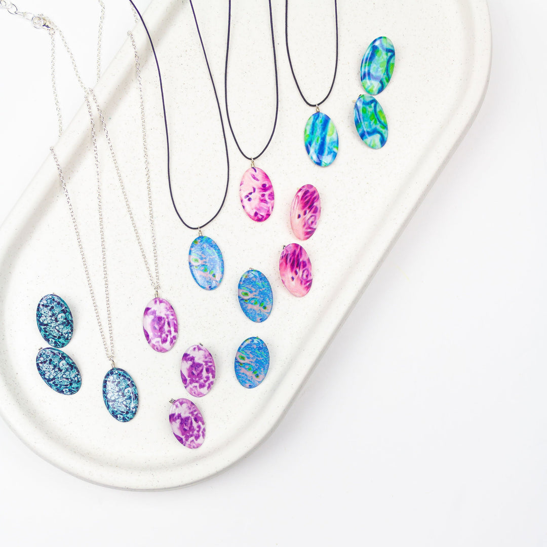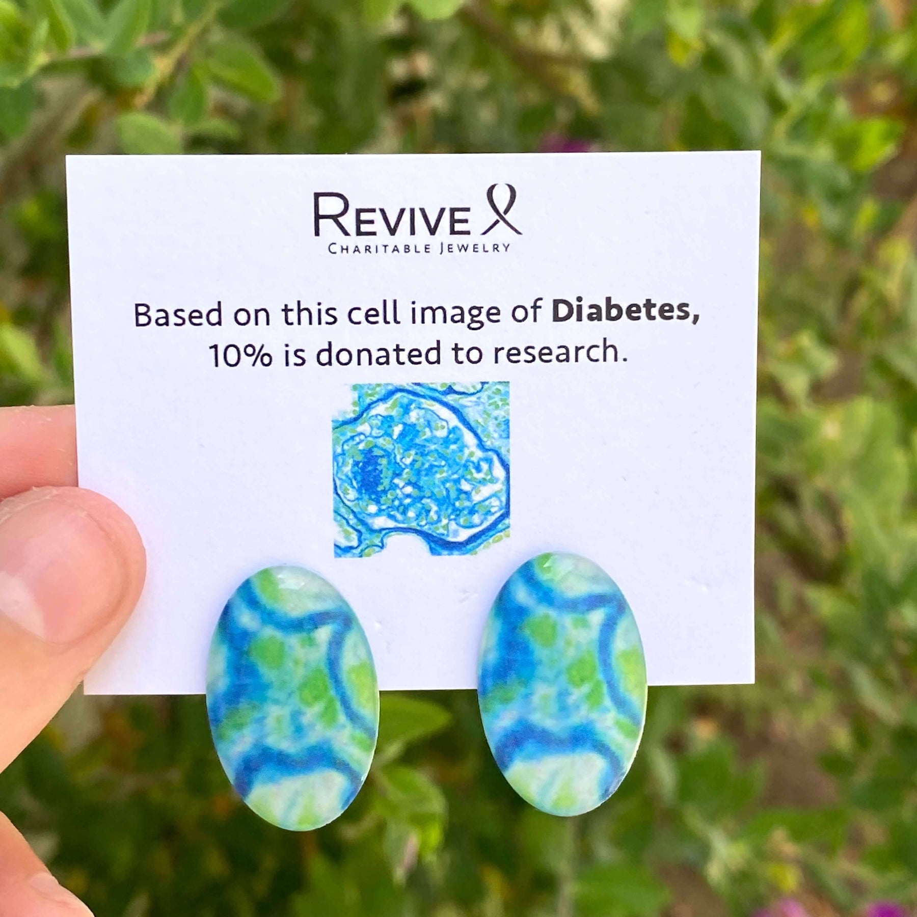 This beautiful large oval pendant is handmade by setting a cell image of Diabetes in resin. Available on a 12-24" adjustable black cord or 16-18" Sterling silver or 14k gold filled chain.