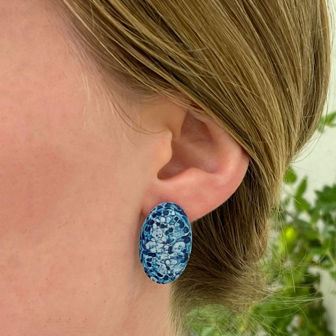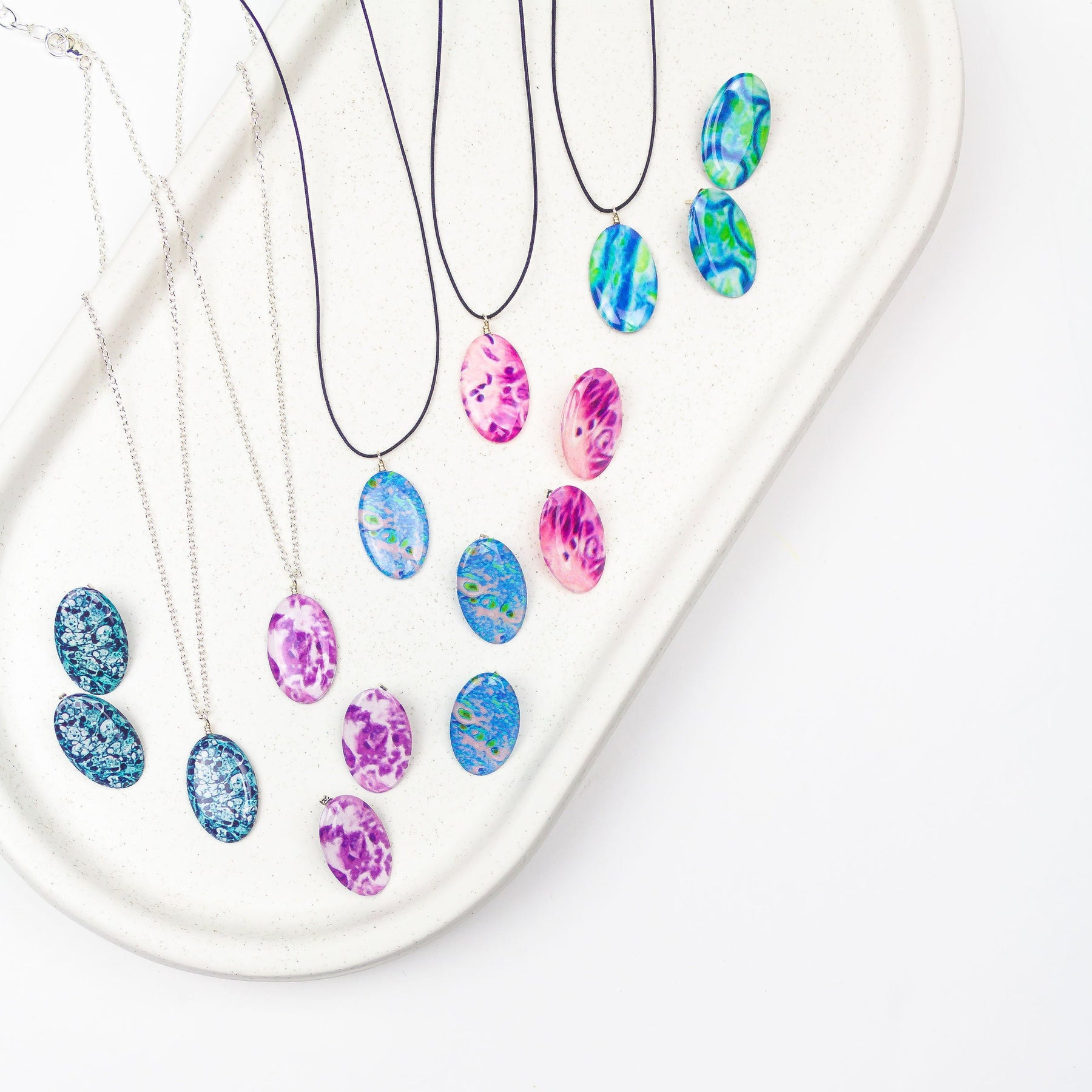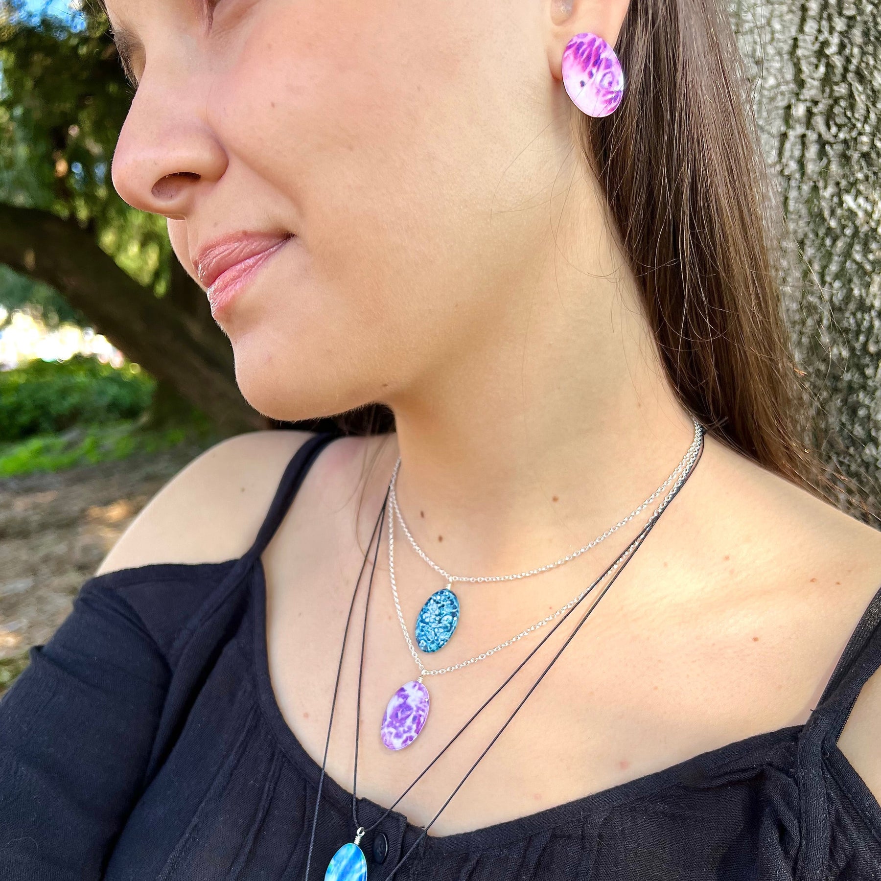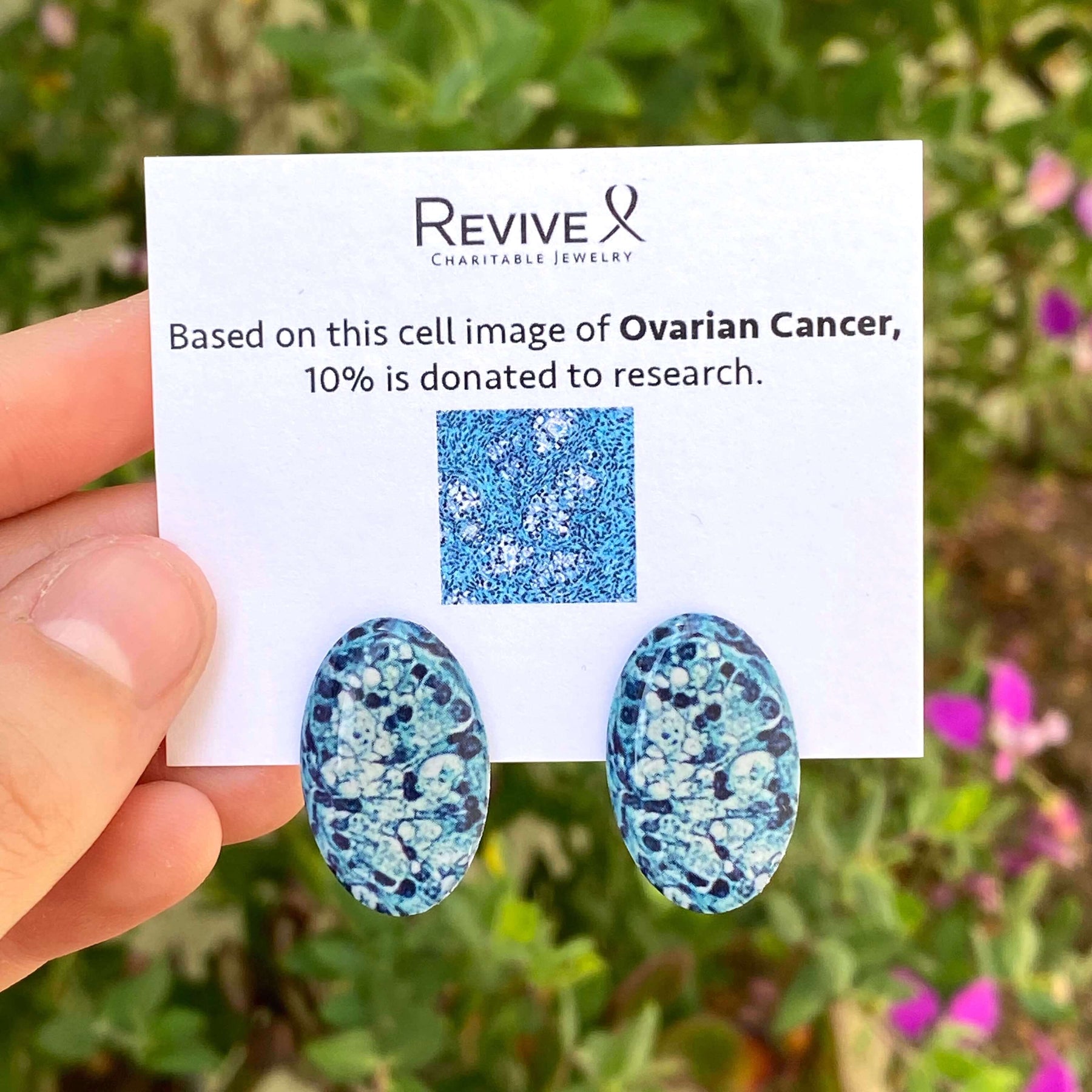 The oval pendant is handmade by coating a cell image of Ovarian Cancer in resin. Paired with your choice of a 12-24" adjustable black cord or 16-18" Sterling Silver or 14k Gold Filled chain.