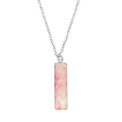 Breast Cancer necklace in sterling silver with a rectangular pendant in shades of pink and white set in resin.