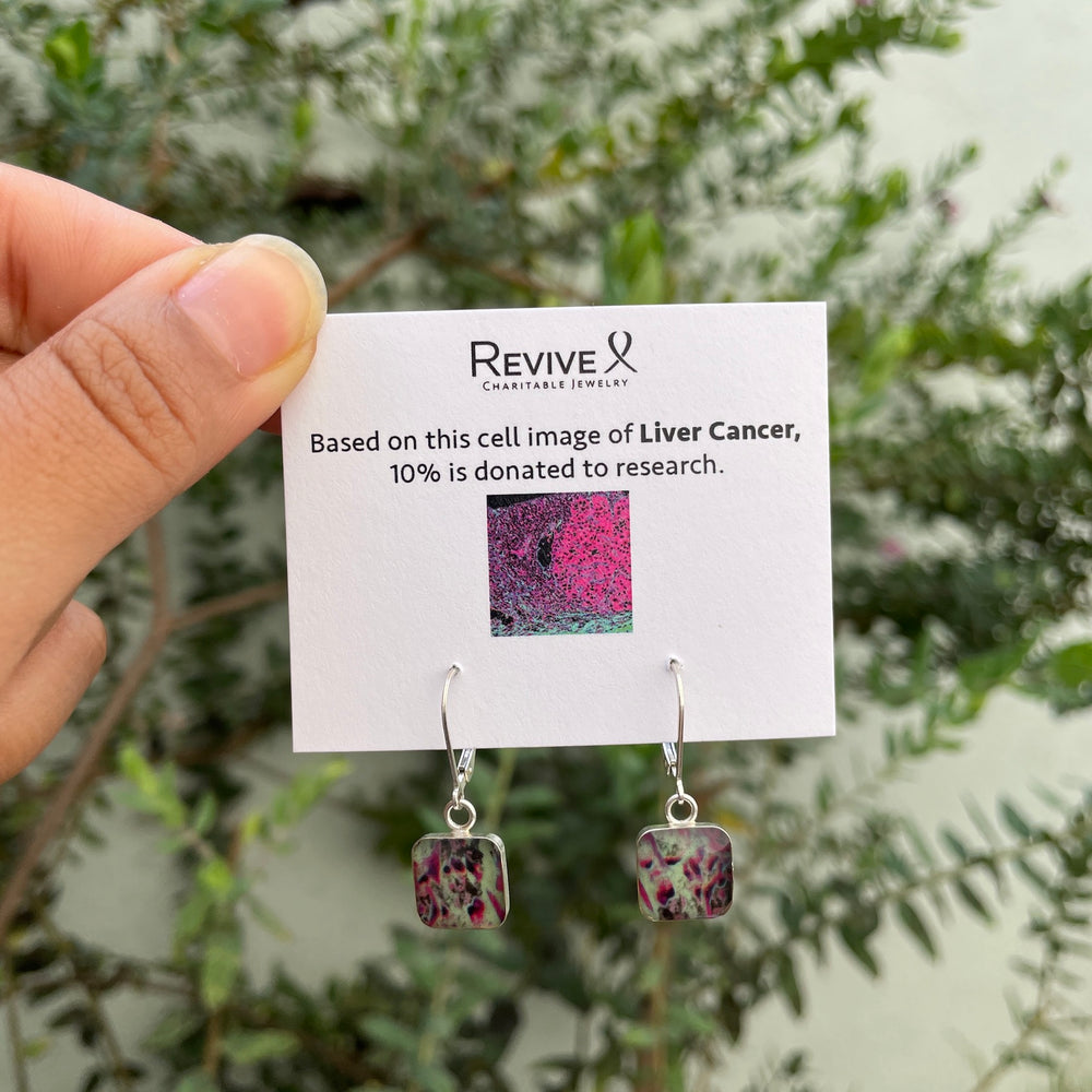 The sterling silver square pendants contain hand cut images of an Alzheimer's cell under resin. Secure lever back closures make sure they’ll stay on all day.