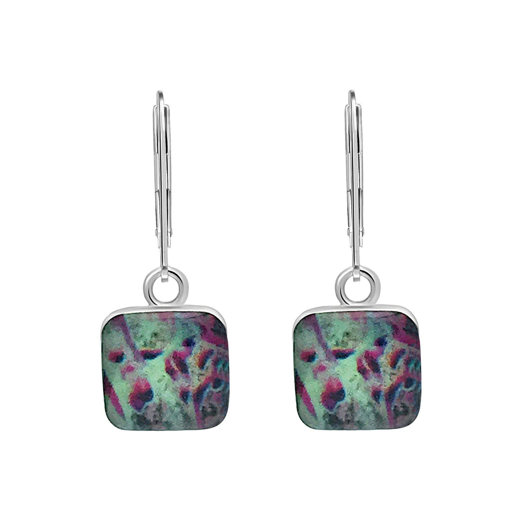 Square Alzheimer's awareness earrings in sterling silver with blue and lime green hanging pendants in resin