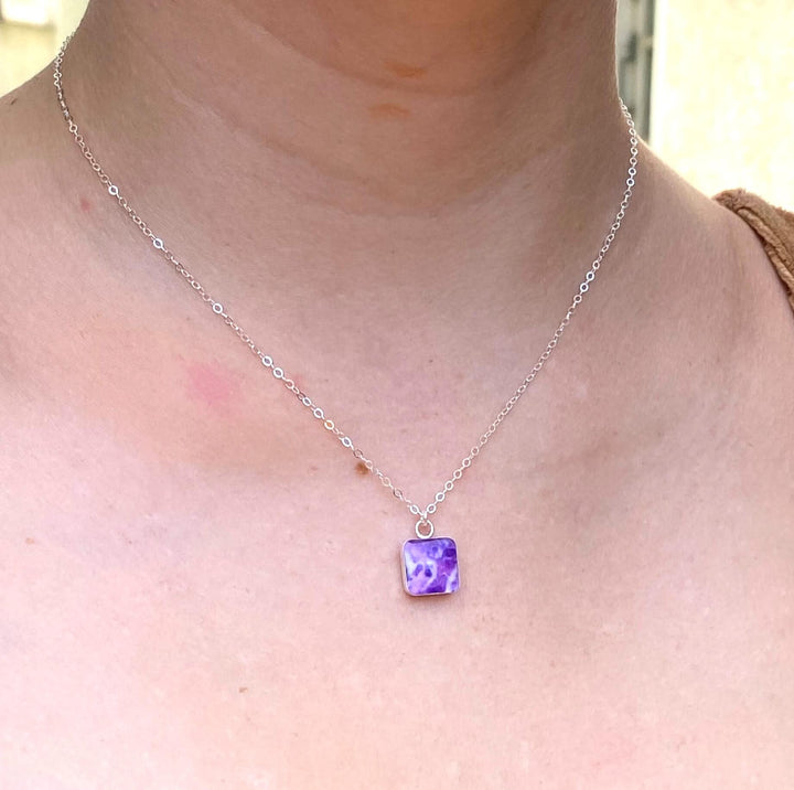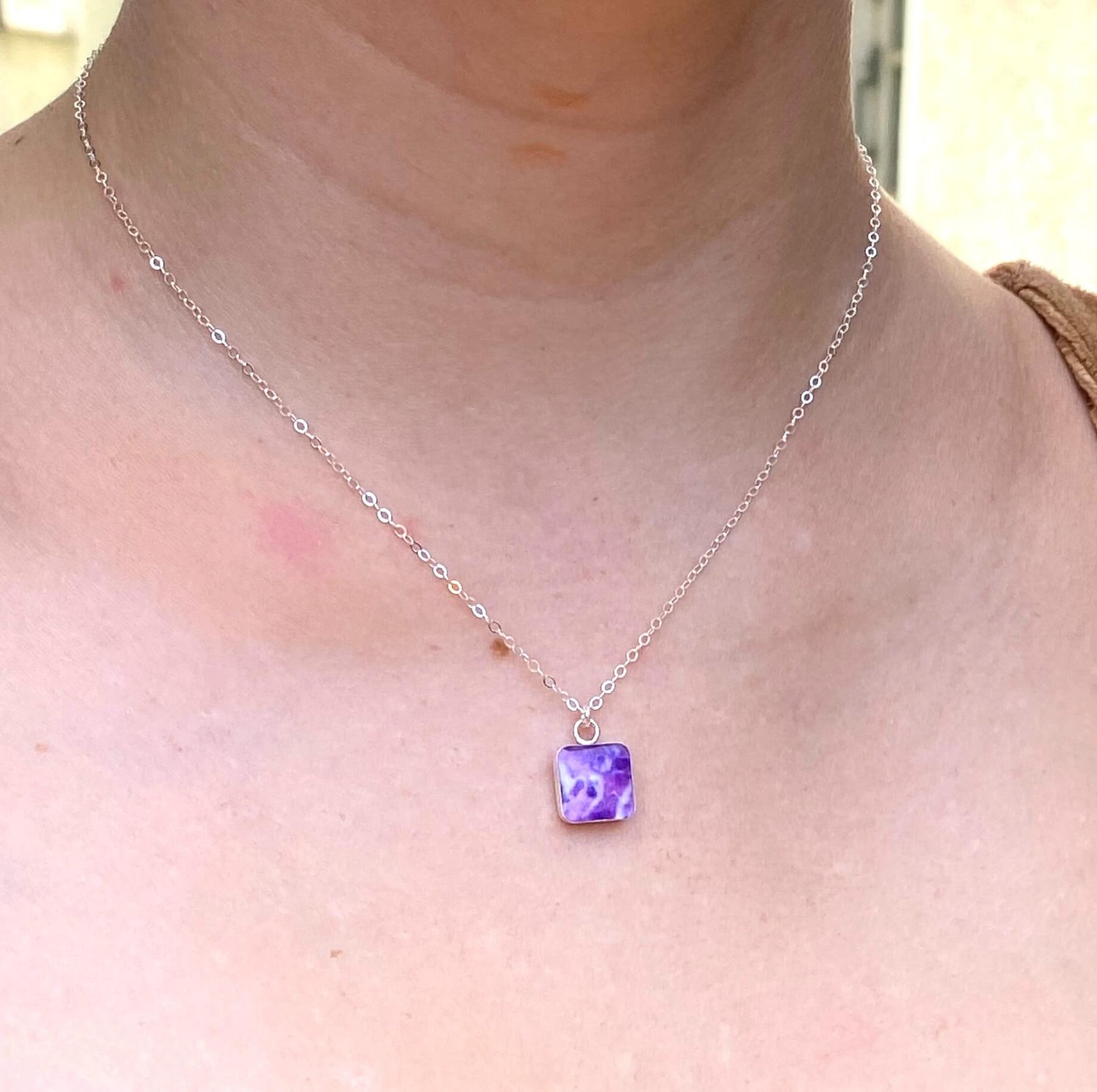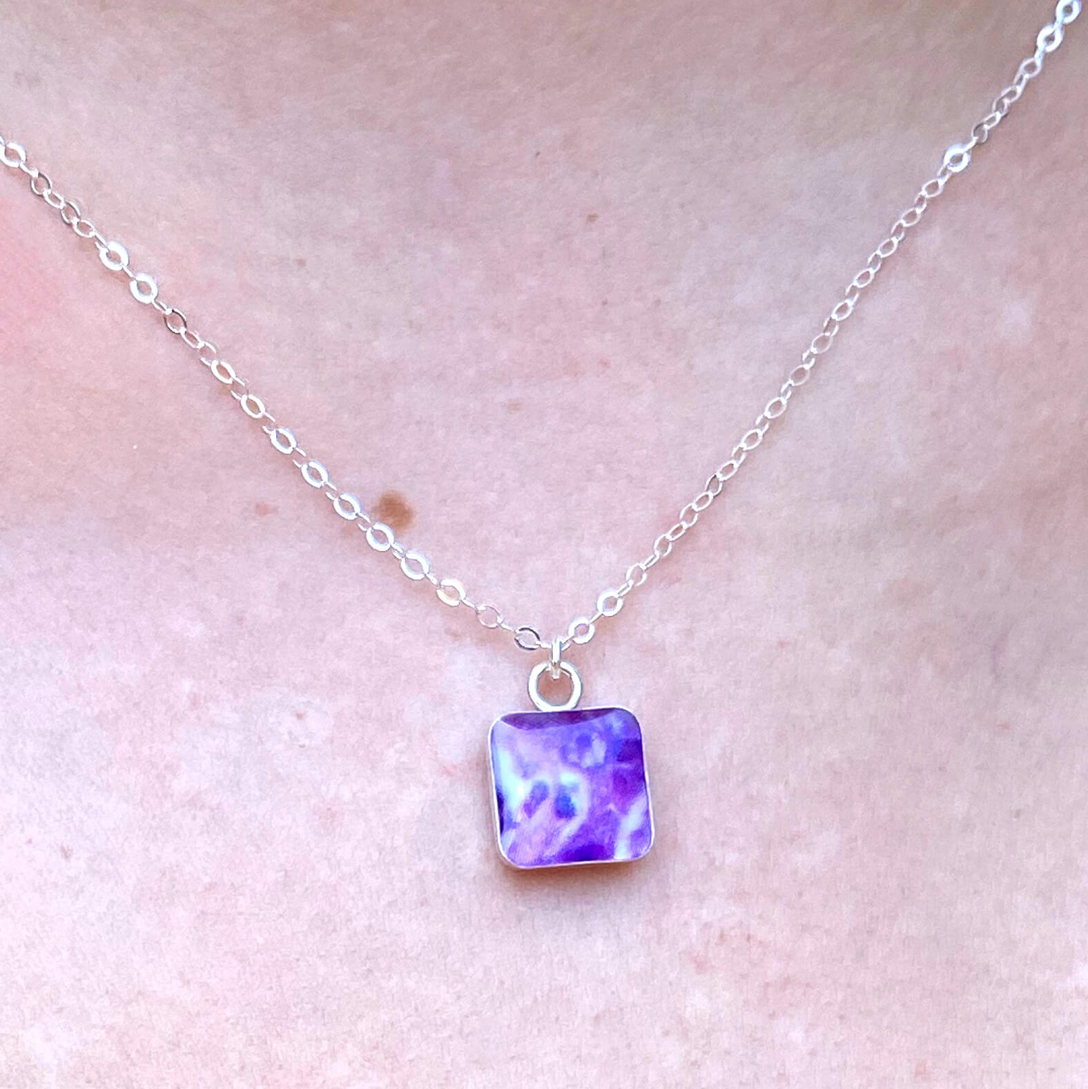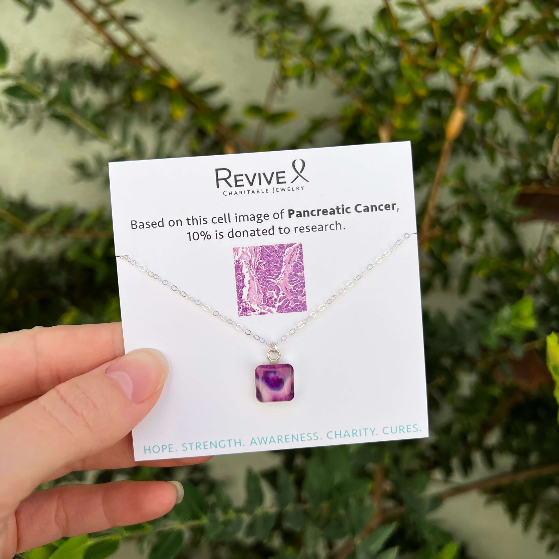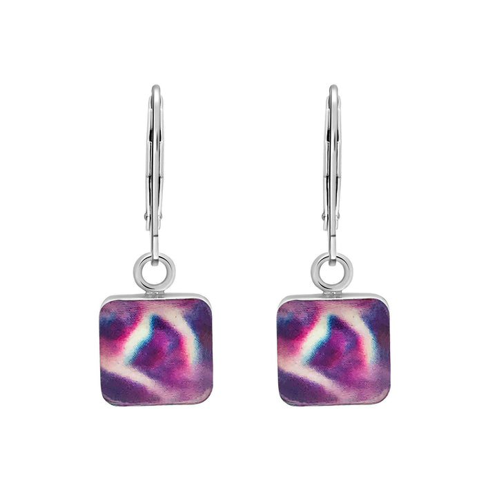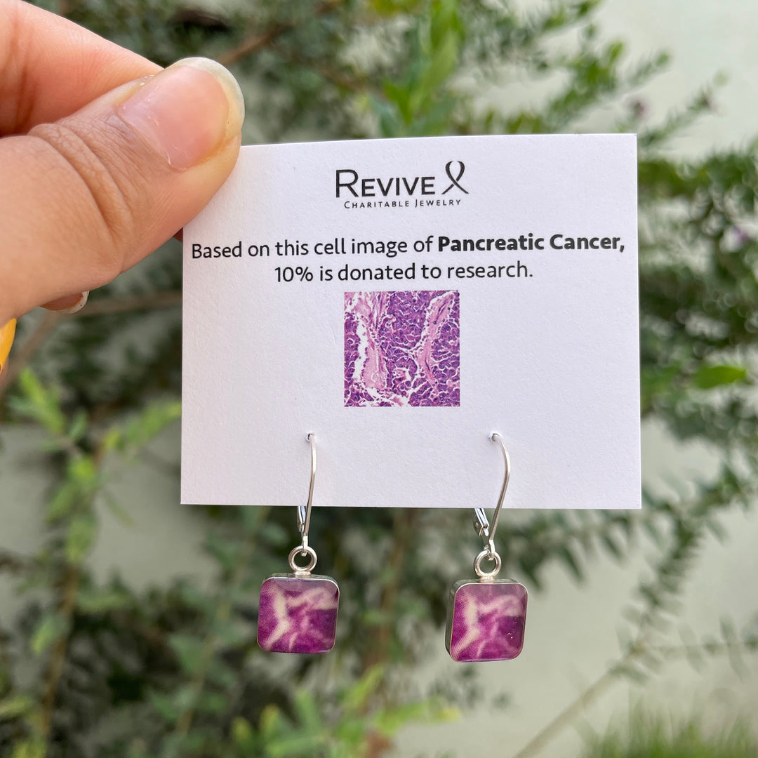 The sterling silver square pendants contain hand cut images of a Pancreatic Cancer cell under resin. Featuring secure lever back closures so you know they’ll stay on all day.