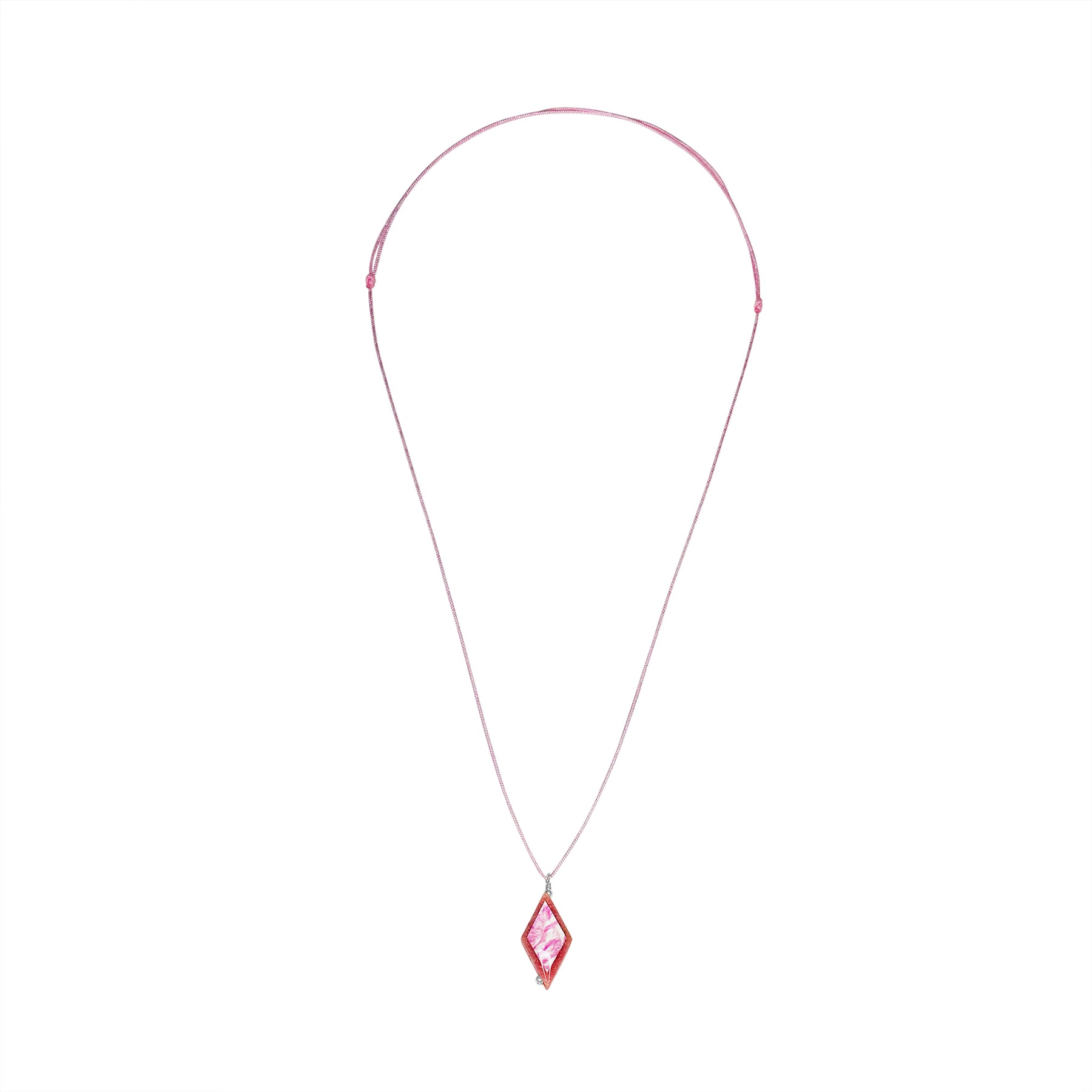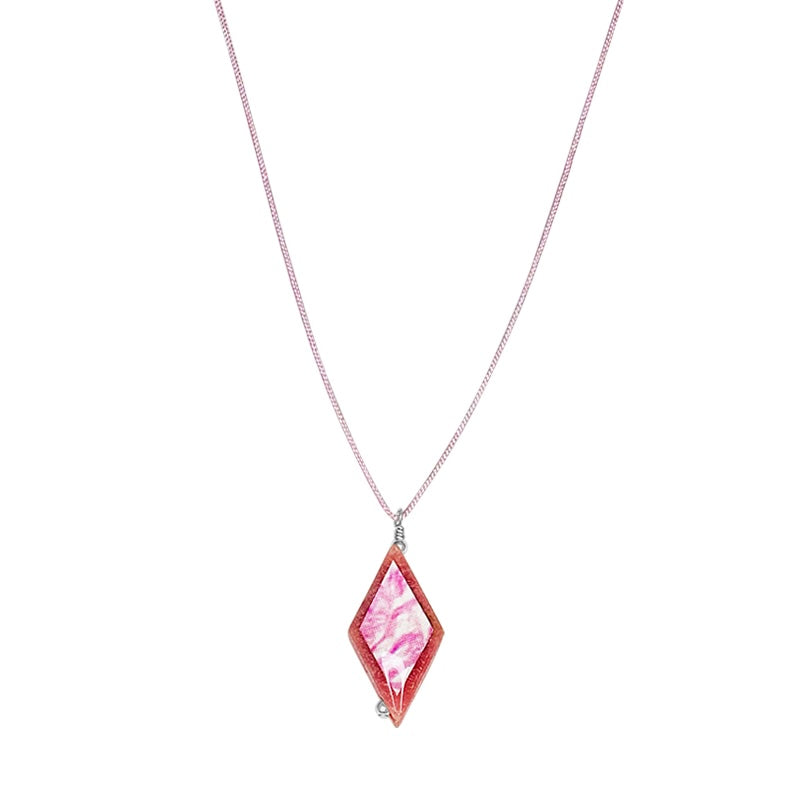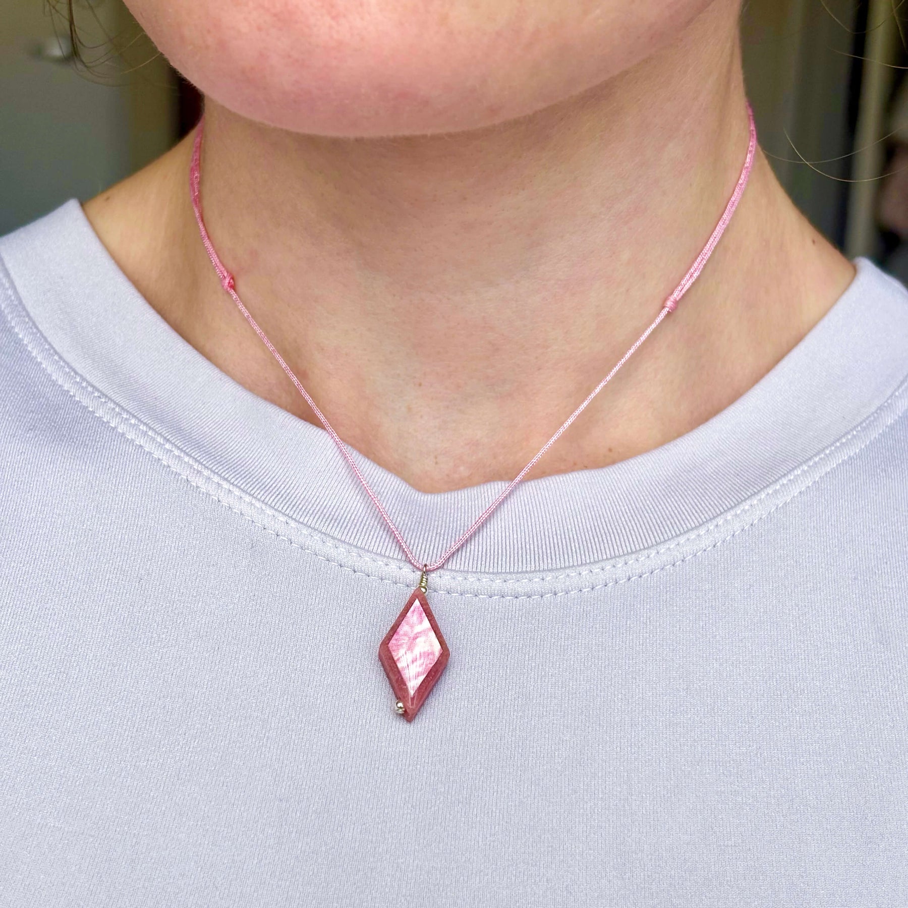 close up of diamond shaped pink rhodonite stone pendant necklace on pink cord featuring breast cancer cell image in resin