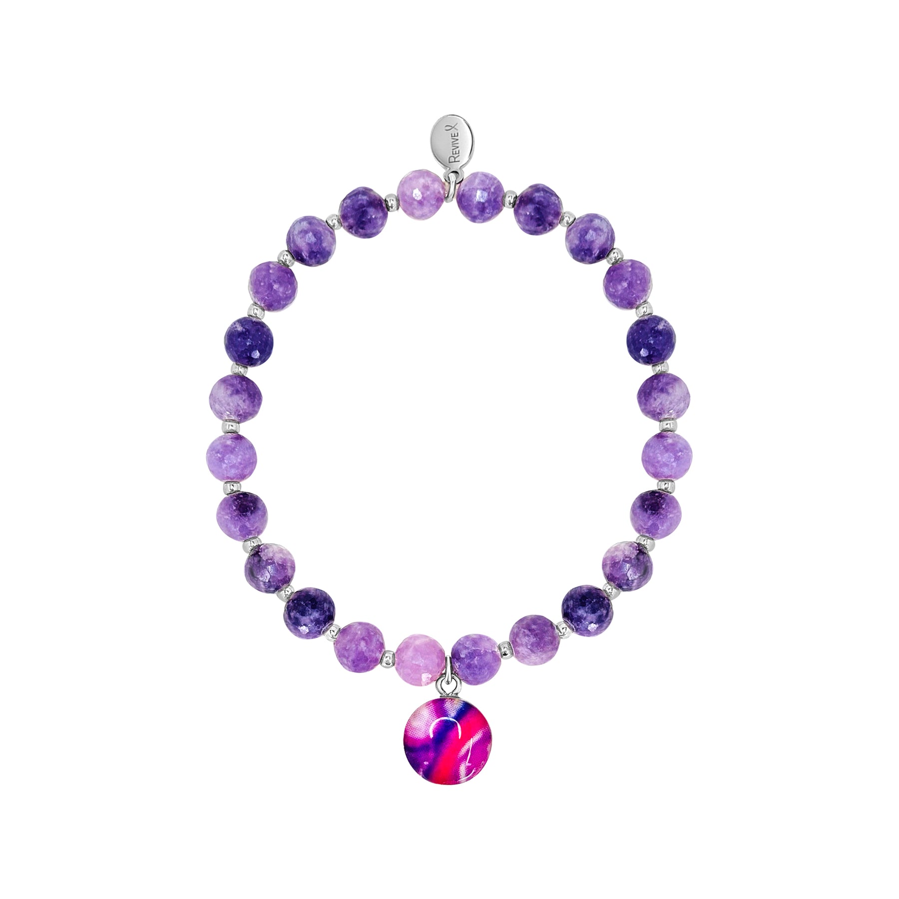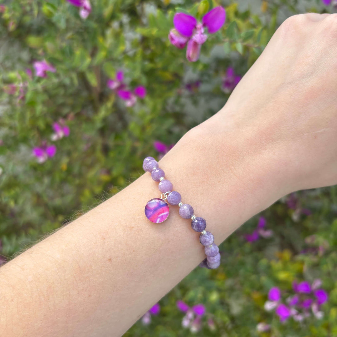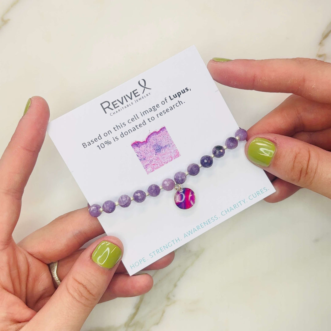 This Lupus bracelet features faceted purple Lepidolite stones and small sterling silver or gold beads with a round pendant that contains a Lupus cell image under resin. Stack up your favorite causes and show your support in style!