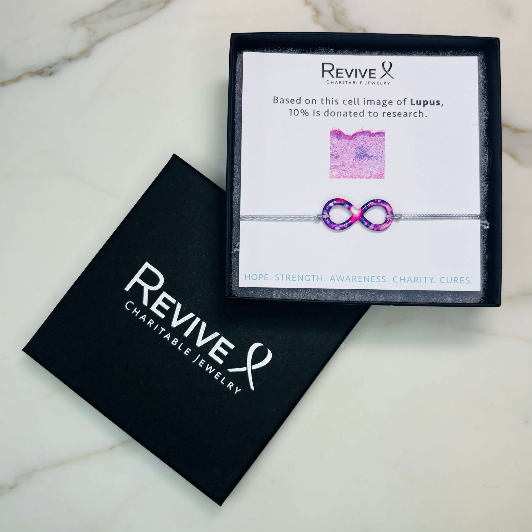 Handcrafted with a cell image of Lupus, the infinity charm is cut out and encased in clear resin, transforming science into art. The design is finished with a durable, adjustable gray cord and a sterling silver slide clasp, offering both comfort, ease and elegance for everyday wear.