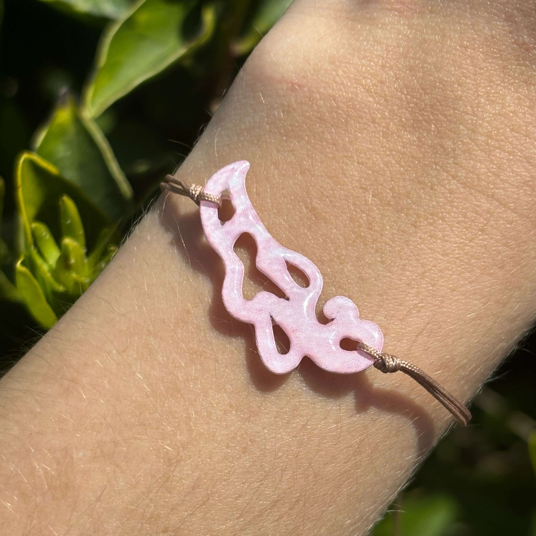 close up of pink paisley shaped breast cancer cell image in resin pendant on silver adjustable cord