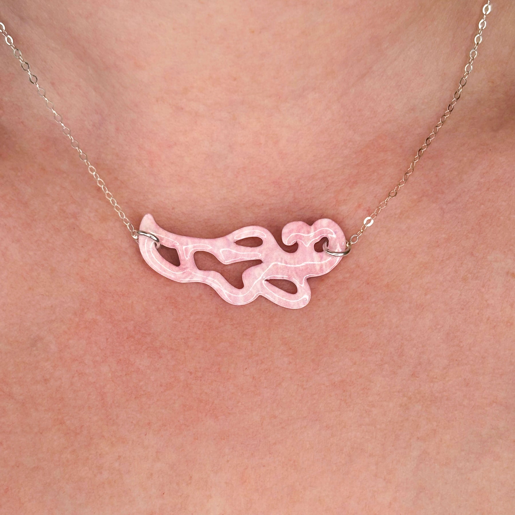close up of pink paisley shaped breast cancer cell image in resin pendant on sterling silver adjustable chain on model