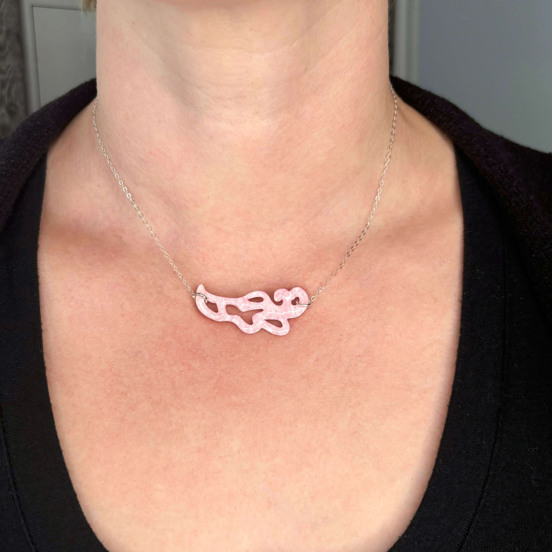 pink paisley shaped breast cancer cell image in resin pendant on sterling silver adjustable chain on model