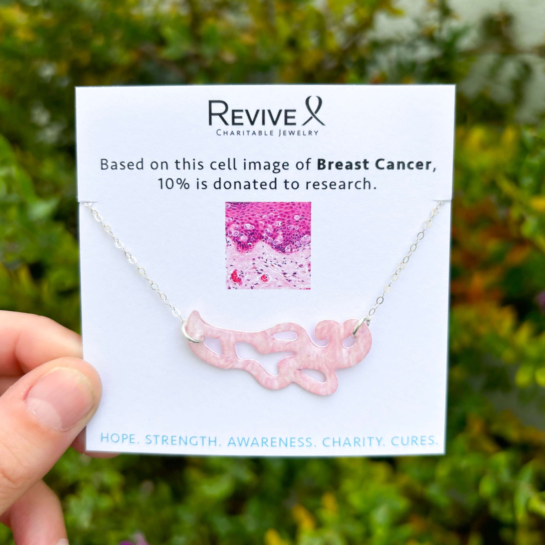 pink paisley shaped breast cancer cell image in resin pendant on sterling silver adjustable chain on product packaging