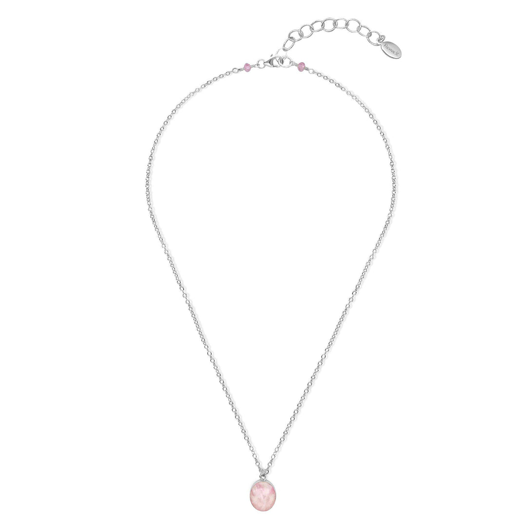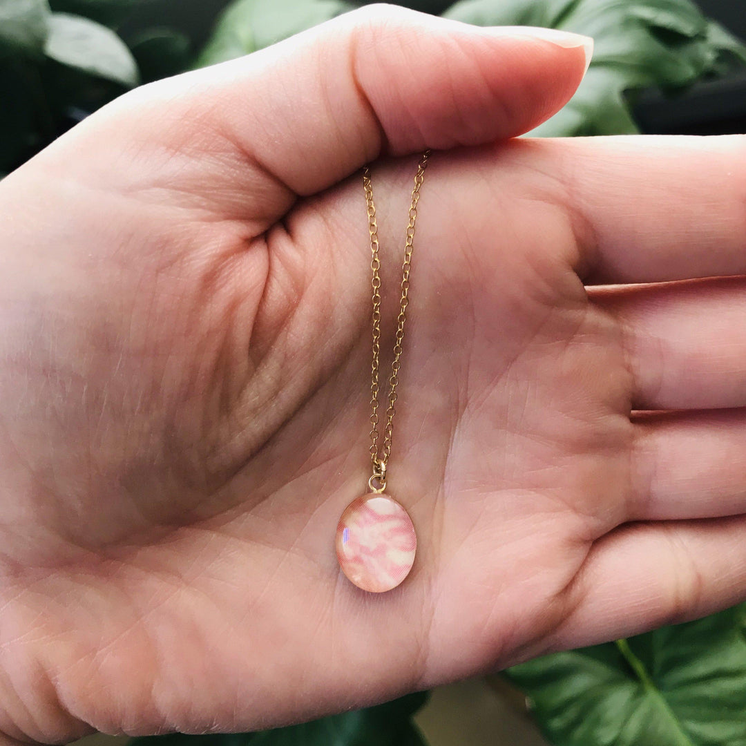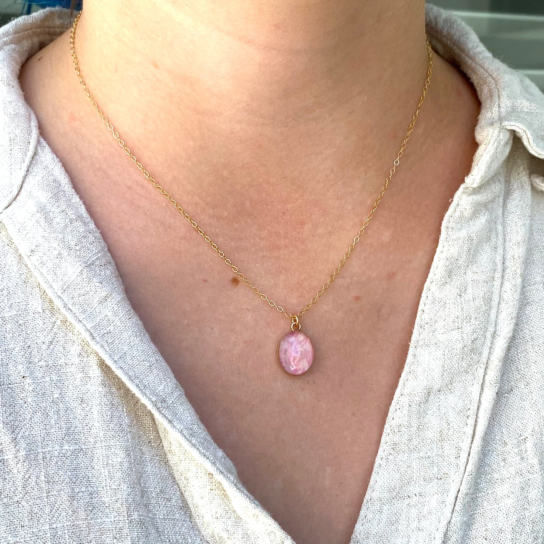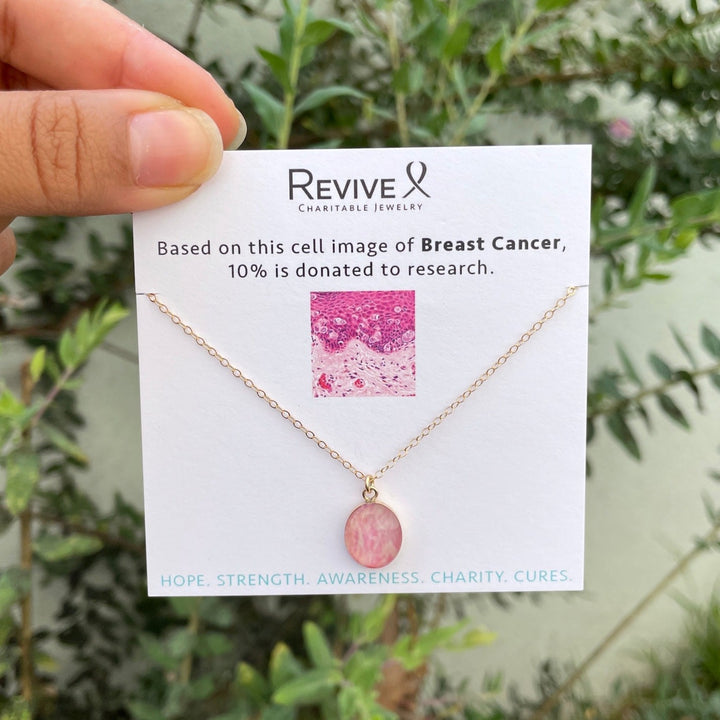 This necklace features an adjustable sterling silver or 14k gold filled chain that can be worn at any length from 16-18 inches. Inspired by all the stories of strong women taken too soon by this disease, the oval pendant is a hand cut Breast Cancer cell image in resin. The chain is securely finished at the ends with two pink Quartz stones.