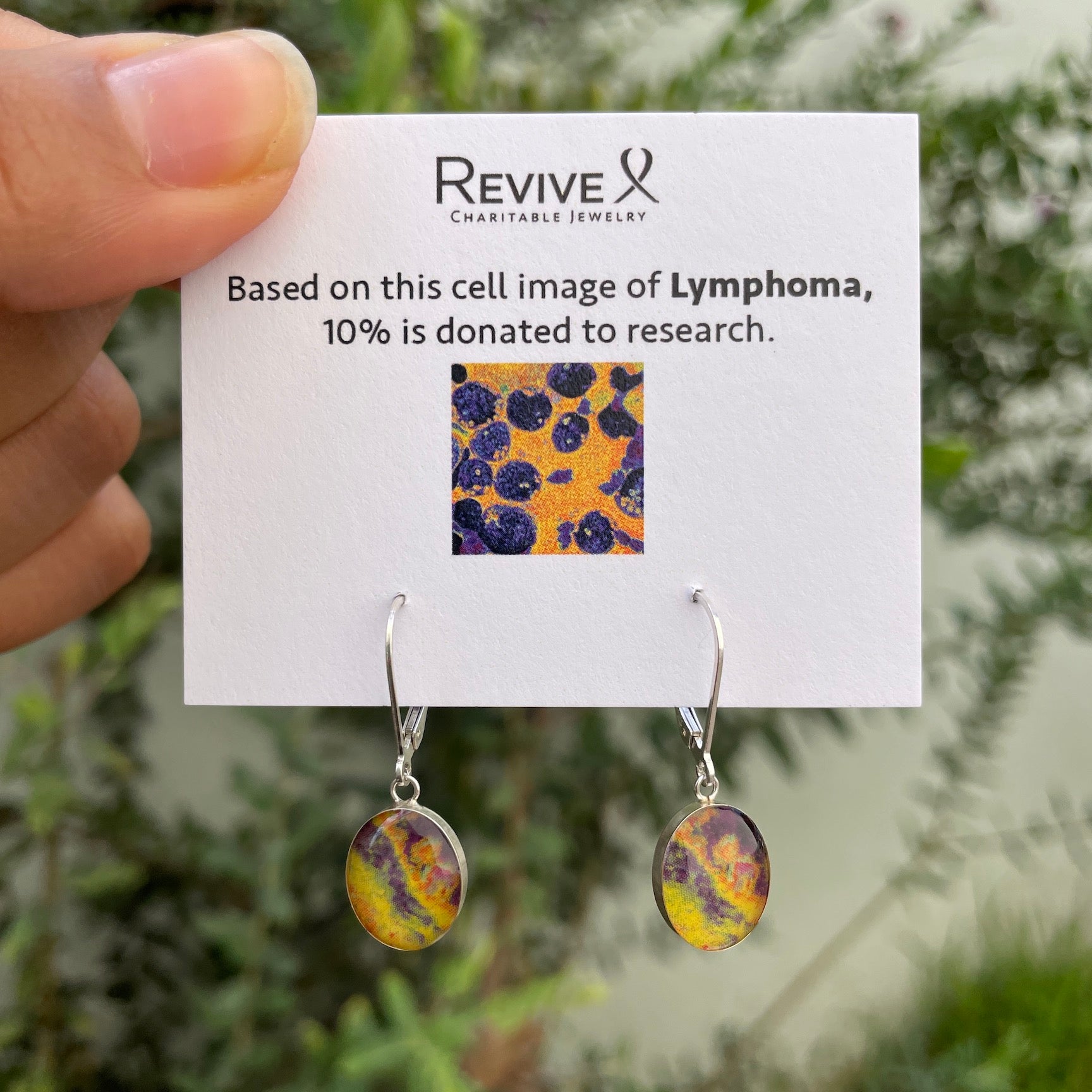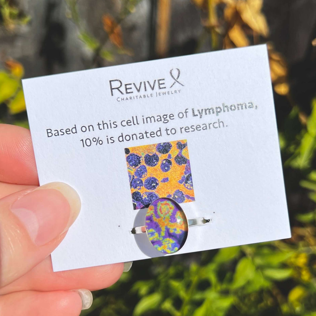This necklace features an adjustable sterling silver or 14k gold filled chain that can be worn at any length from 16-18 inches. Inspired by all the stories of lives taken too soon by this disease, the oval pendant is a hand cut Lymphoma cell image in resin. The chain is securely finished at the ends with two purple Chalcedony stones.