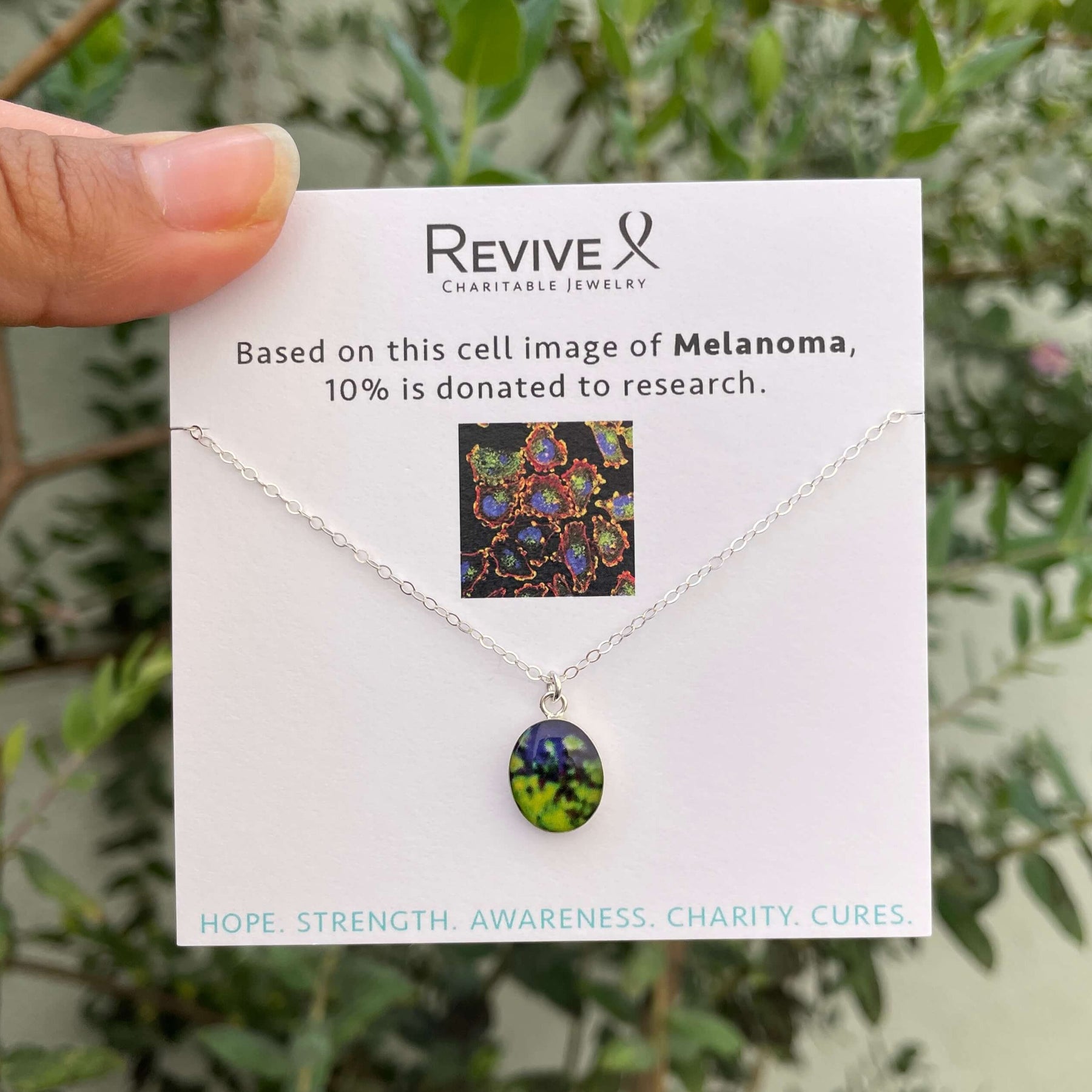 This necklace features an adjustable sterling silver or 14k gold filled chain that can be worn at any length from 16-18 inches. The oval pendant is a hand cut cell image of Melanoma set in resin. The chain is securely finished at the ends with two faceted black Spinel stones.