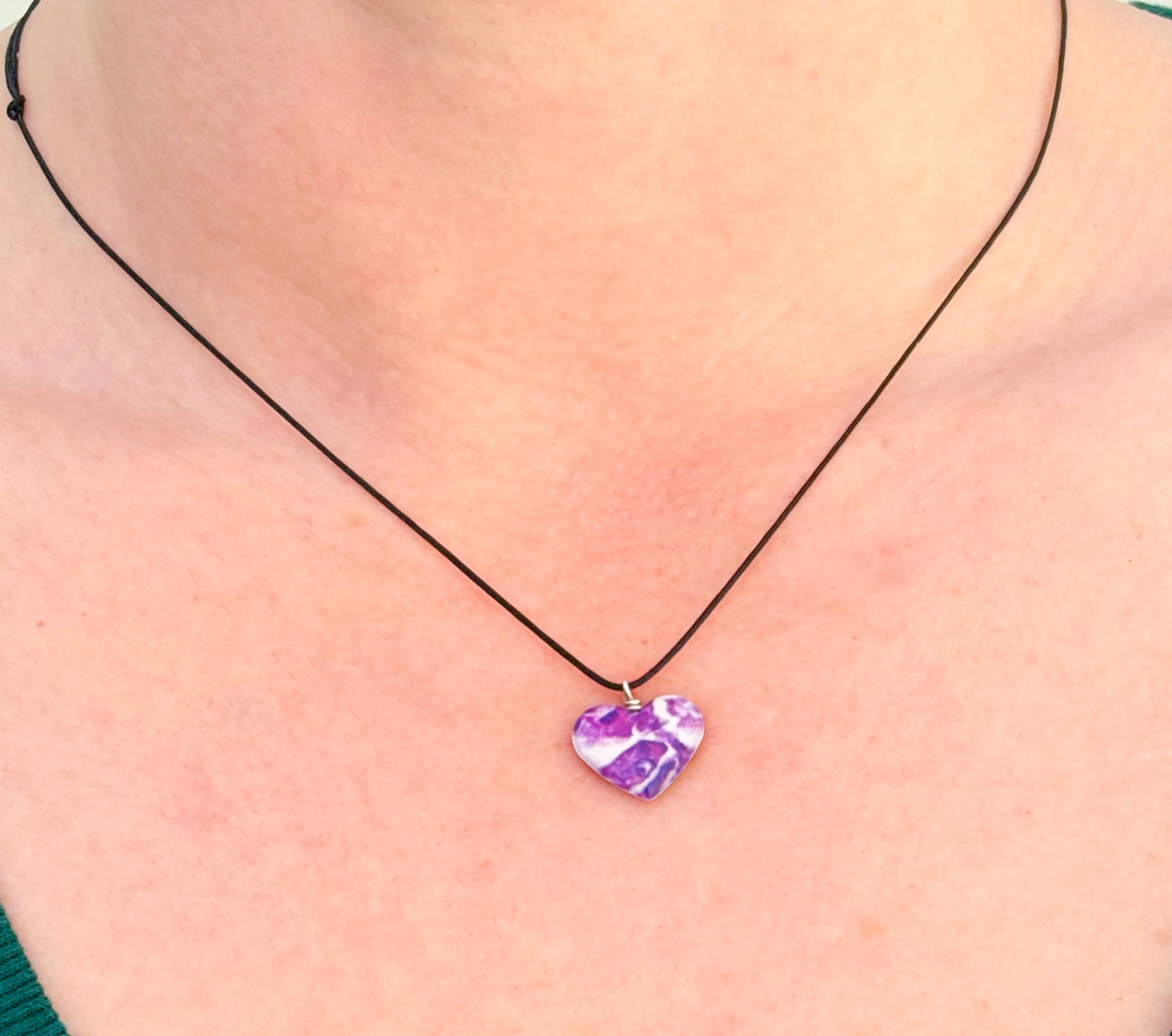 model wearing purple heart shaped stud earring for pancreatic cancer awareness that gives back to charity