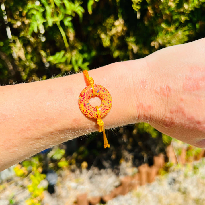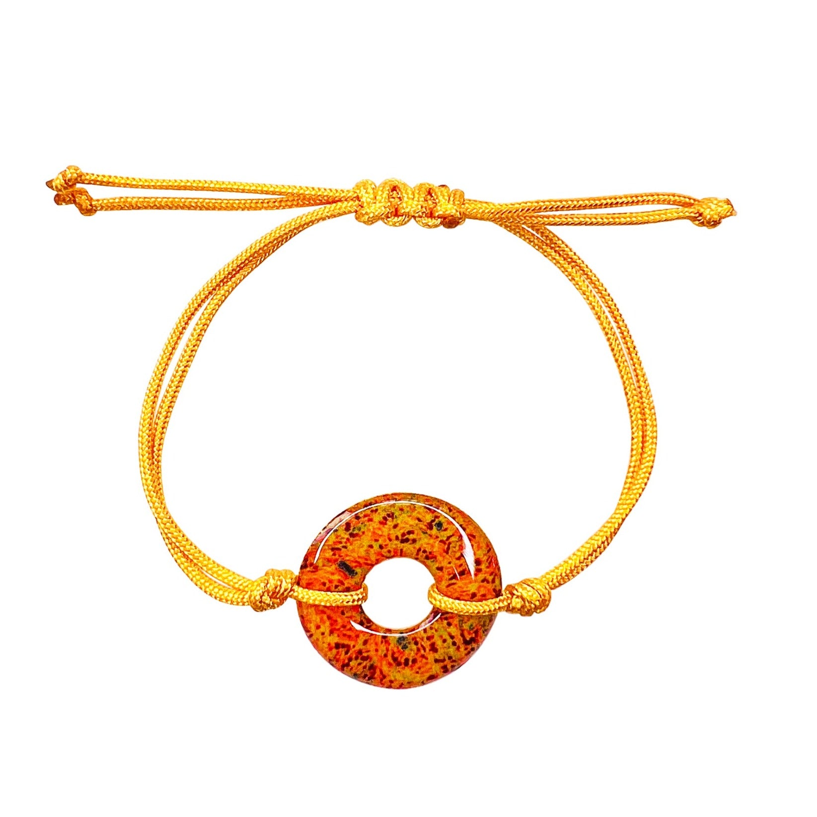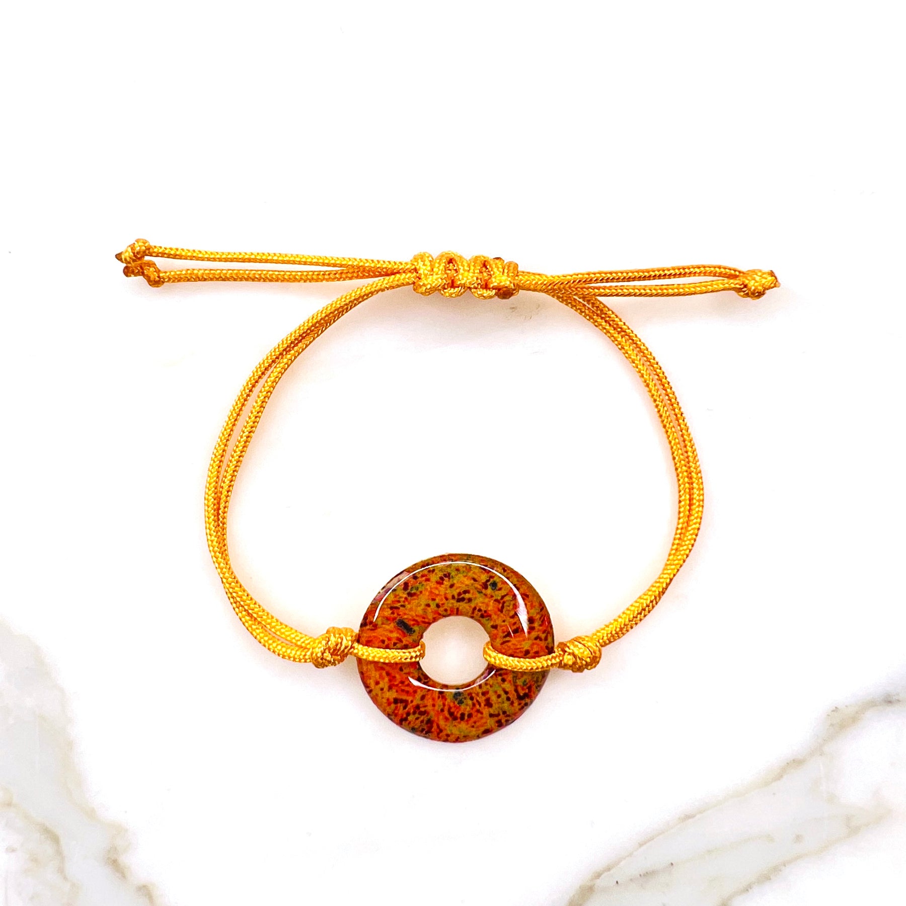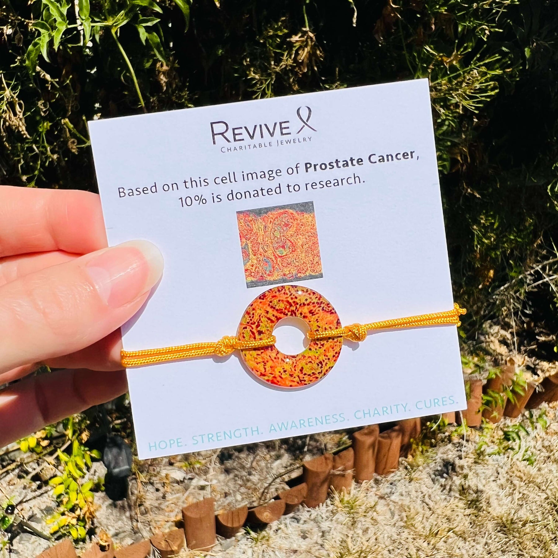 This bracelet features a golden yellow adjustable nylon cord that fits wrists from 5 to 9 inches. The large round Life Saver pendant is based on a cell image of Prostate Cancer coated in resin. Add this cancer awareness bracelet to your every day jewelry- it's great on its own or for stacking.
