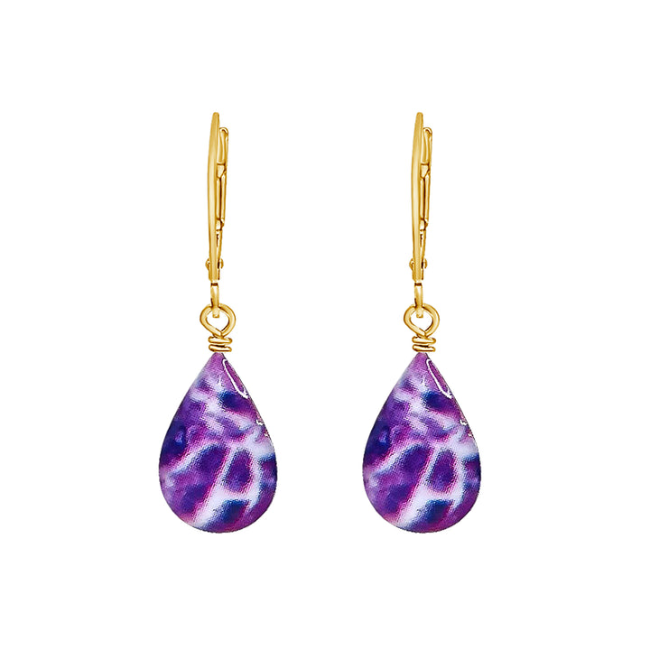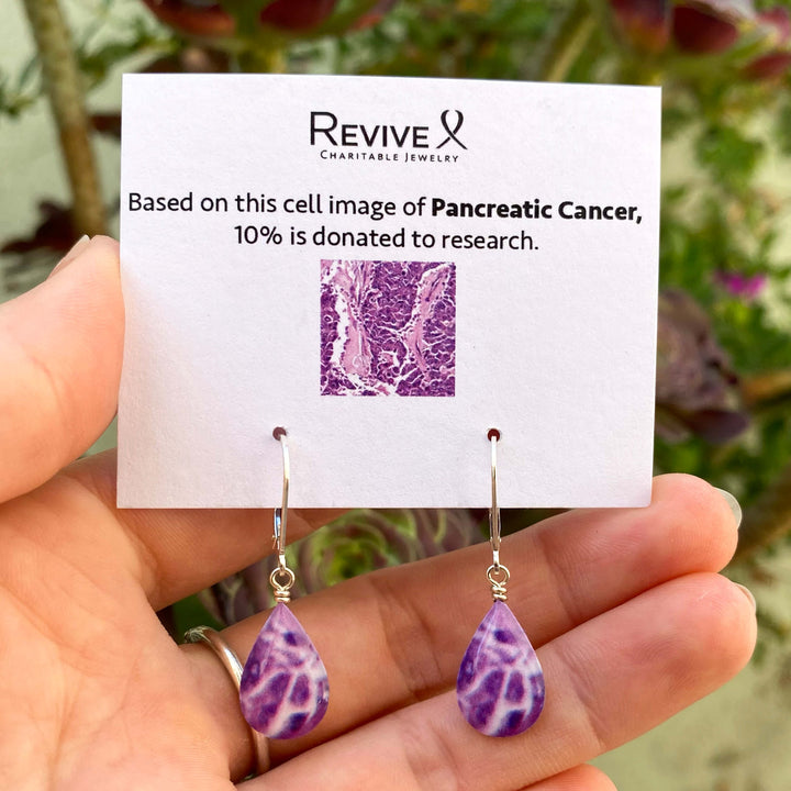 Featuring teardrop shape pendants made by setting images of a Pancreatic Cancer cell in resin. Available in sterling silver or 14k gold filled metals and finished with secure lever back closures. Feel fashionable and generous with these cute dangle earrings that give back.