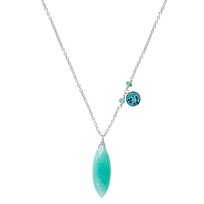 This asymmetrical chain in sterling silver or 14k gold filled features a large faceted marquis shaped Amazonite stone as the center piece. Complimented by a small round pendant with a hand cut photo of an Ovarian Cancer cell encased in resin and surrounded by two small teal Apatite stones.